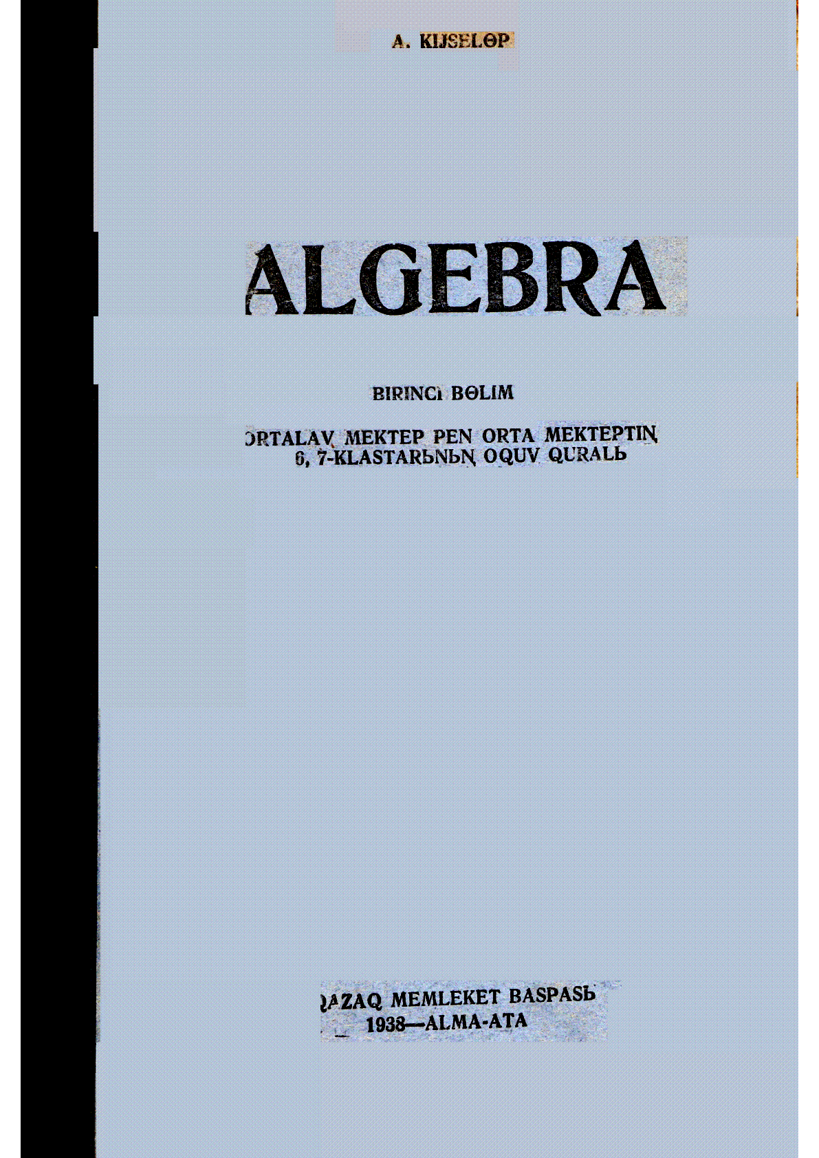 Алгебра [Мәтін] : Орталау мектептер мен орта мектептің 6, 7-кластарының оқу құралы / А. Киселев ; ред. қараған А. Н. Борсуков ; [жауапты ред. М. Әмірбаев] ; ҚазССР Оқу Халық комиссариаты . – 4-бас. , түзет. .- Алма-Ата : Қазақ мемлекет баспасы , 1938.– 34150 дана . (мұқ.) - Мәтін латын қарпімен қазақ тілінде . 1-бөлім .– 123, [1] б. (мұқ.) : 30 тг.