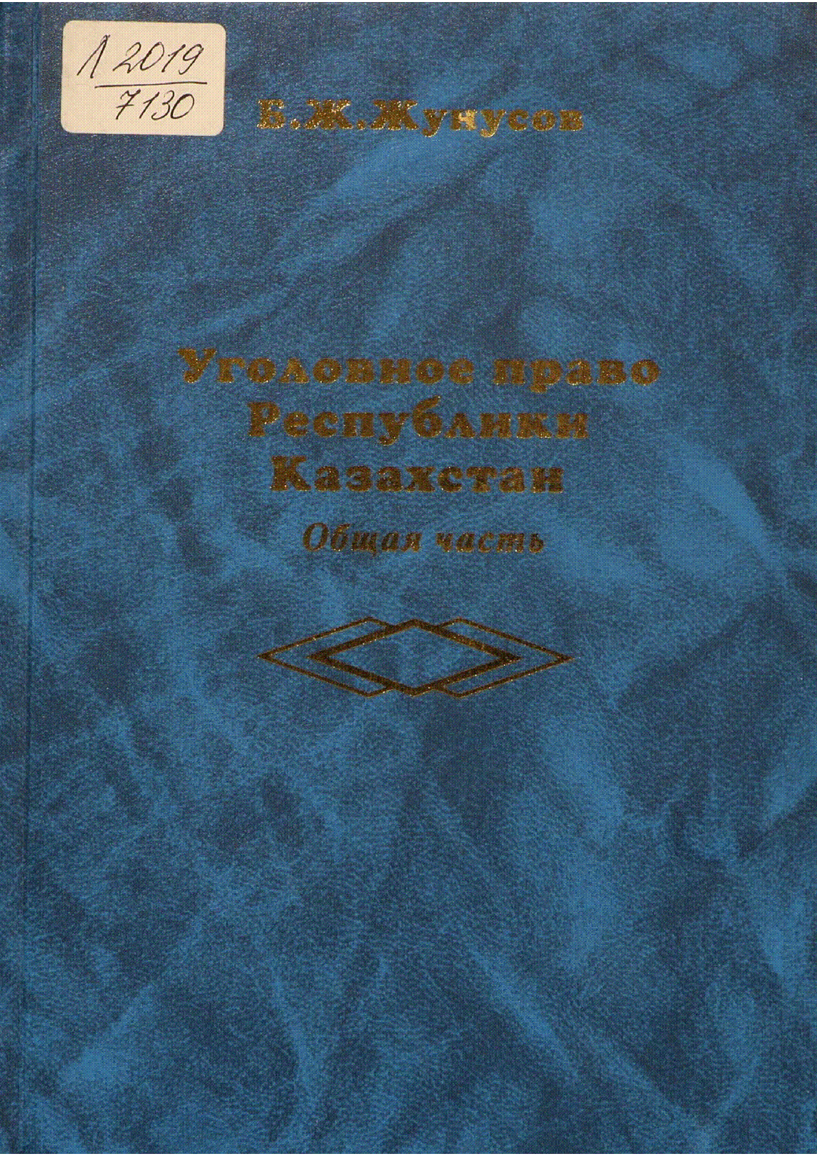 Уголовное право Республики Казахстан [Текст] : (общая часть) / Б. Ж. Жунусов ; М-во науки и образования РК, Юрид. акад. "Фемида". – 2-е изд. ., доп. и перераб.. – Караганды : [б. и.], 2006. - 294, [8] с. . – Библиогр. в конце гл. . – 1000 экз. – ISBN 9965-9775-9-3 (в пер.) : 600 тг.