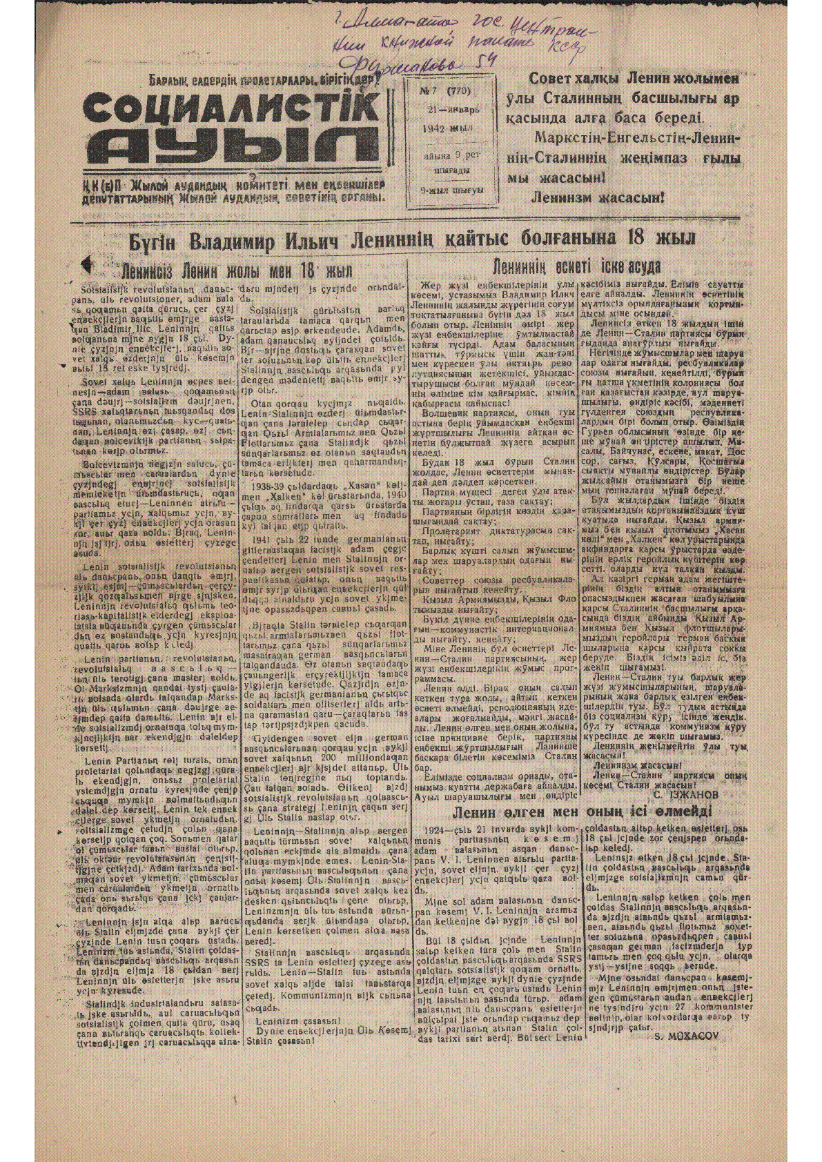 Социалистік ауыл [Мәтін] / Жауапты редактор: Н. Ирғалиев. .– 1630 дана.– Айына 9 рет шығады. 1942. - 21 январь. - №7 (770). - 1630 дана