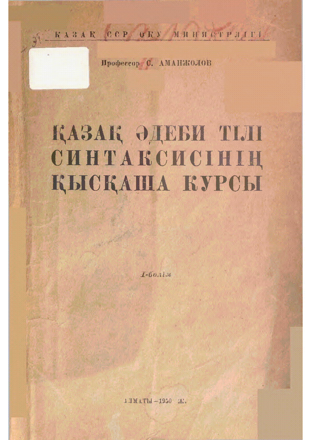 Қазақ әдеби тілі синтаксисінің қысқаша курсы [Мәтін] : жоғарғы мектеп оқушылары үшін оқу құралы / С. Аманжолов ; Қазақ ССР оқу министрлігі ; Мұғалімдерді сырттан оқыту ғылыми-методика кабинеті... – Алматы : [б. ж.], 1950. - 85, [3] б. - Шора Сарыбаев қоры . . – 3000 дана : 0 тг.