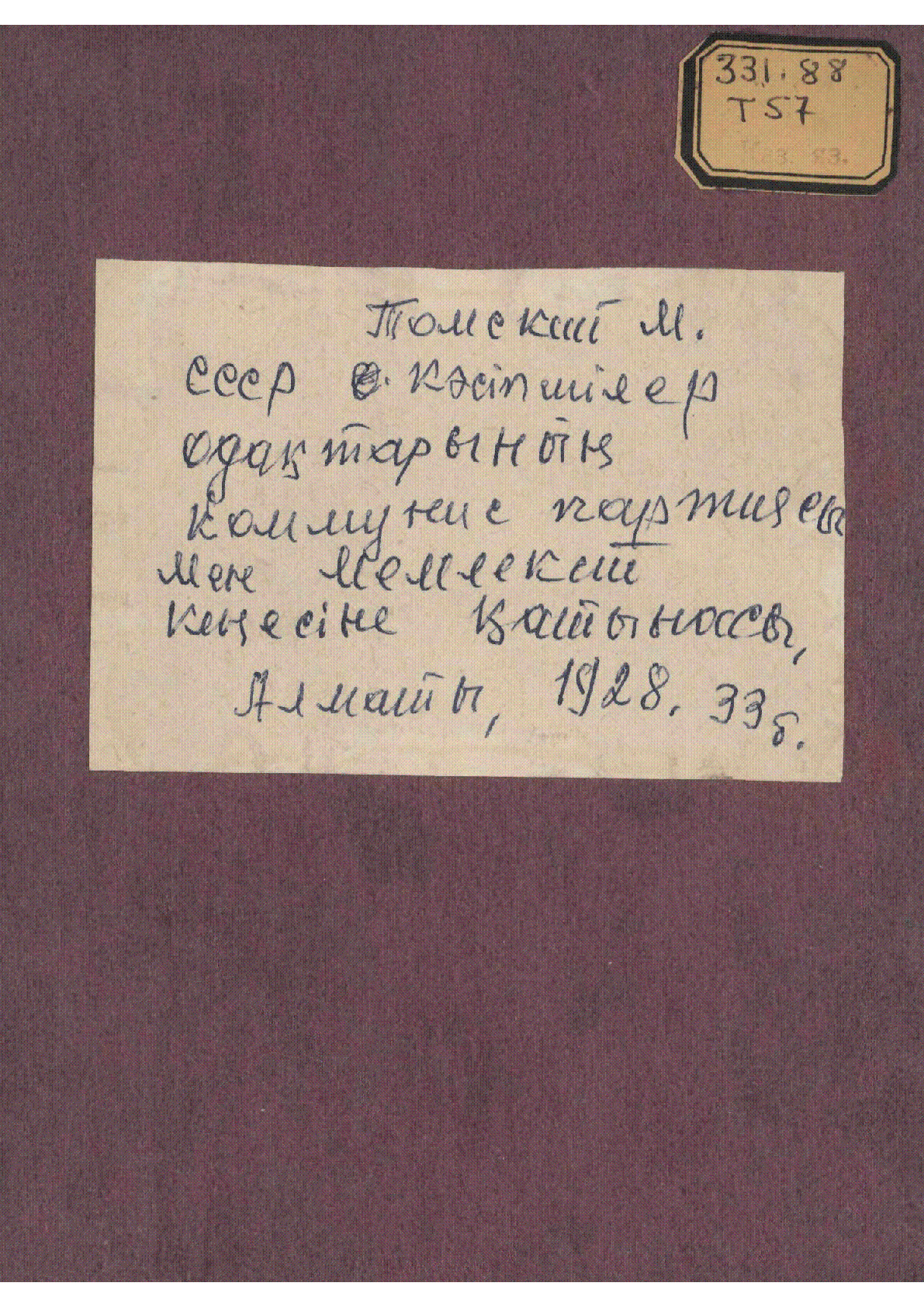 СССР кәсіпшілер одақтарының коммунис партиясы мен Кеңес мемлекетіне қатынасы = س.س.س.ر. كەسىبشىلەر وداقتارىنىڭ كومەنەس پارتىياسى مەن كەڭەس مەملەكەتىنە قاتىناسى [Мәтін] / М. Томский ; Қазақстан кәсіпшілер одағы кеңесінің баспасөз бөлімі / ауд. Жұмаш (Еленов)... – Қызылорда : Тип. КЦСНХ №1, 1928. - 34 б 18х13,5 см - Мәтін араб графикасымен жазылған. . . – 3000 дана : 20 т.