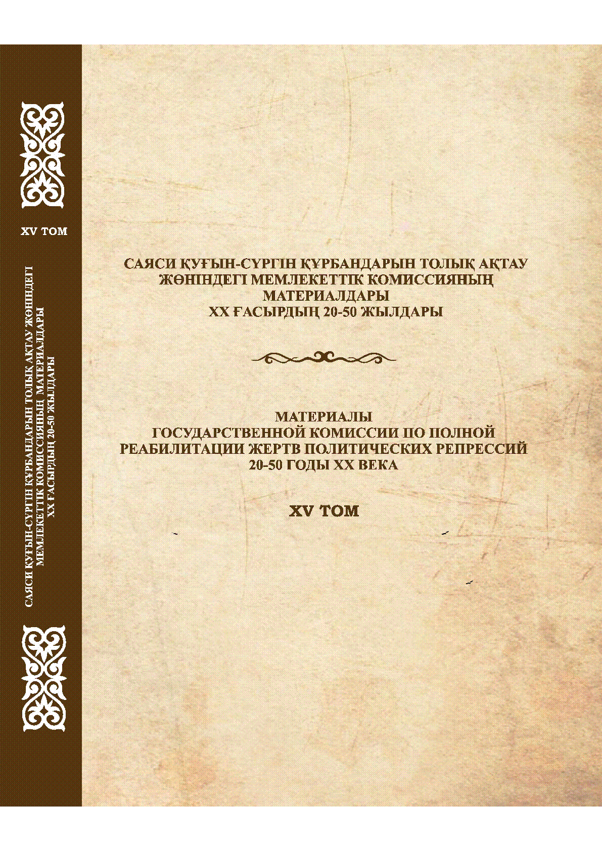 Саяси қуғын-сүргін құрбандарын толық ақтау жөніндегі Мемлекеттік комиссияның материалдары (ХХ ғасырдың 20-50 жылдары) [Текст] : сборник документов и материалов ; [под общ. ред. Е. Т. Карина ; редкол.: С. Нұрбек [и др.] ; редкол. тома: Е. Н. Шуланов [и др.] ; сост.: А. Г. Ибраева [и др.] ; Мин-во науки и высшего образования РК ; Ин-т истории и этнологии им. Ч. Ч. Валиханова ; Проектный офис Гос. комиссии по полной реабилитации жертв политических репрессий] .- Астана : [б. и.] , 2022.– 1000 экз. . – ISBN 978-601-08-0994-9 (в пер.) - Выпущено по программе "Повышение конкурентоспособности сферы культуры и искусства, сохранение, изучение и популяризация казахстанского культурного наследия и повышение эффективности реализации архивного дела", по подпрограмме "Приобретение, издание и распространение социально-важных видов литературы" Министерства культуры и спорта Республики Казахстан. - Текст на рус., каз. . Т. 15 . Северный Казахстан и Алаш– 407 с., [5] л. ил. . (в пер.) : 0 тг.
