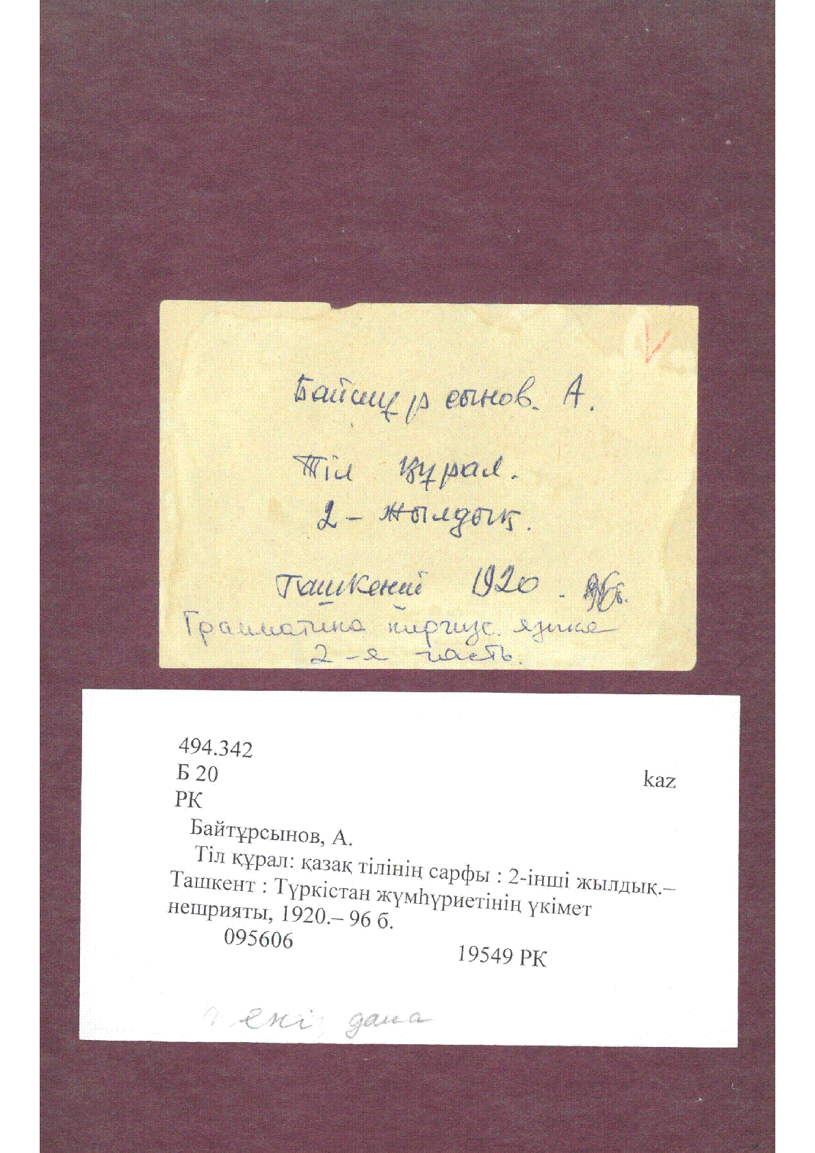 Тіл құрал = ءتىل-قورال [Мәтін] : қазақ тілінің сарфы / А. Байтұрсынов ... – Ташкент : Түркістан жүмһүриетінің үкімет нешрияты, 1920. - 96 б. 25,5х17,5 см - Микрофиша, - Мәтін араб графикасымен жазылған . .