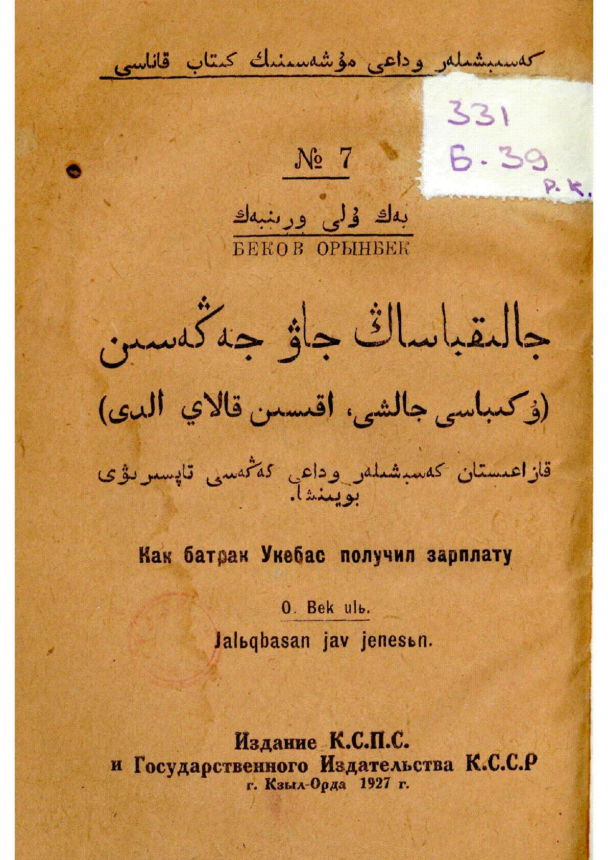 Жалықпасаң жау жеңесің = جالىقباساڭ جاۇ جه ݣه سىن [Мәтін] : Үкібас жалшы ақысын қалай алды / О. Беков ... – Қызылорда : Қазмембас, 1927. - 39 б. 13х18 см. – (Кәсіпшілер одағы мүшесінің кітапханасы N7. - Мәтін араб графикасымен жазылған . . – 3000