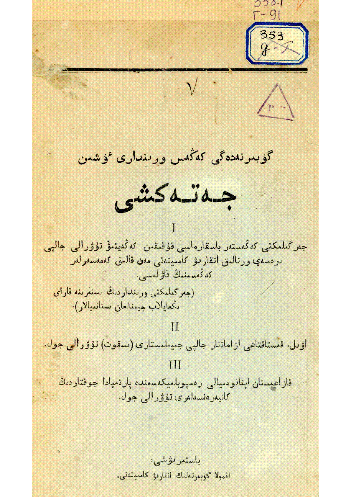 Губерниядағы кеңес орындары үшін жетекші [Мәтін] / ... – Ақмола : Гос. тип., 1927. - 36 б. 17х25,5 см. - Мәтін араб графикасымен жазылған . . – 2000 дана