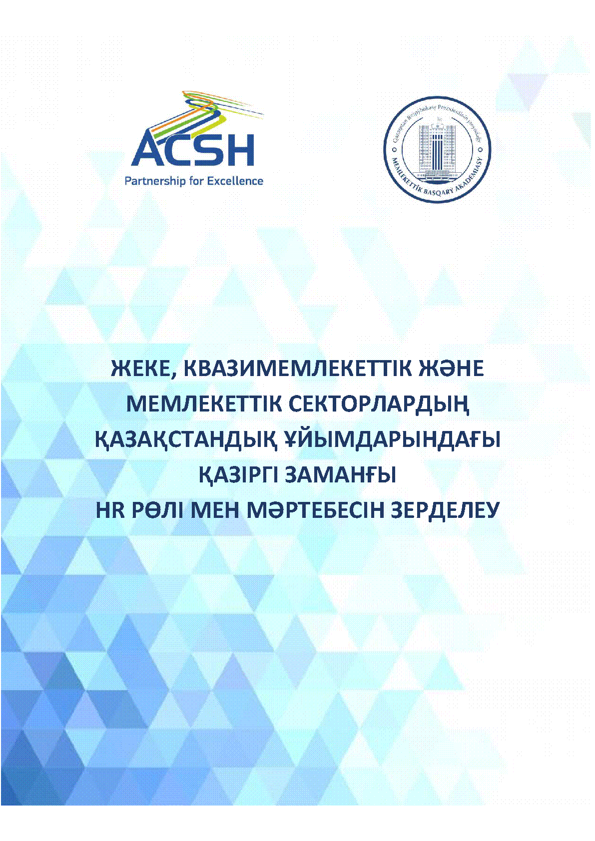 Жеке, квазимемлекеттік және мемлекеттік секторлардың қазақстандық ұйымдарындағы қазіргі заманғы HR рөлі мен мәртебесін зерделеу [Мәтін] / ; [жет.: Г. Б. Райысова, Қ. Х. Нұрбек ; жобалау ком. құрамы: Г. Б. Райысова [ж. б.]]... – Нұр-Сұлтан : [б. ж.], 2020. - 169 б. - Мәтін қаз., орыс тілд. . – Библиогр.: с. 167-168, 169 б. . – [т. ж.]