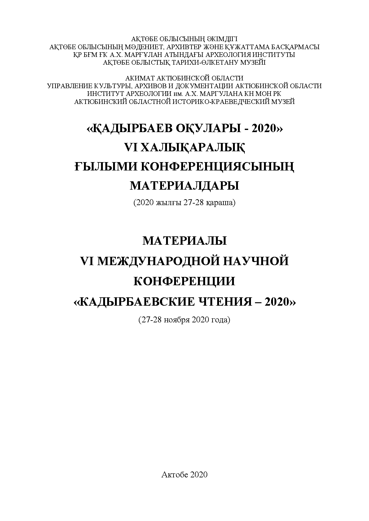 Байтлеу, Д. А. Результаты исследований археологического комплекса эпохи бронзы Тарангул на севере Орь-Илекской возвышенности в 2020 году [Текст] / Д. А. Байтлеу, Ж. С. Калиева // Қадырбаев оқулары - 2020. - 2020. - С. 7-22. - Библиогр.: с. 14-22 ISSN<br>