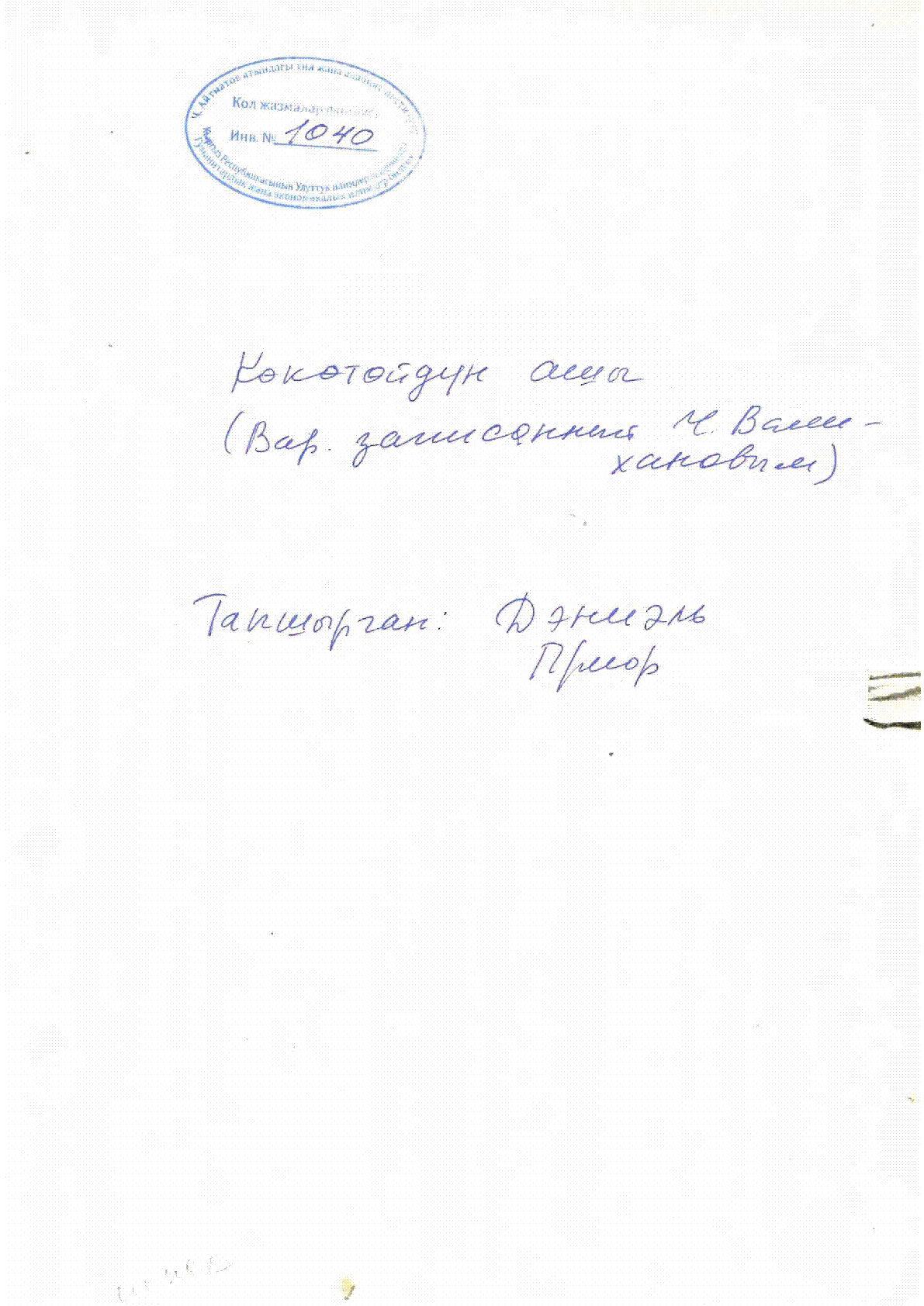 Көкөтөйдүн ашы [Manuscript] : вариант записанный Ч. Валихановым / ; тапшырган Дэниель Приор ; перевод с кыргызского на казахский А. Маргулан ; расшифровка на латыни А. Т. Хатто... – Фрунзе : [б. и.], [19__]. - [27] л. - Текст на чагатайском языке . . – [б. т.]