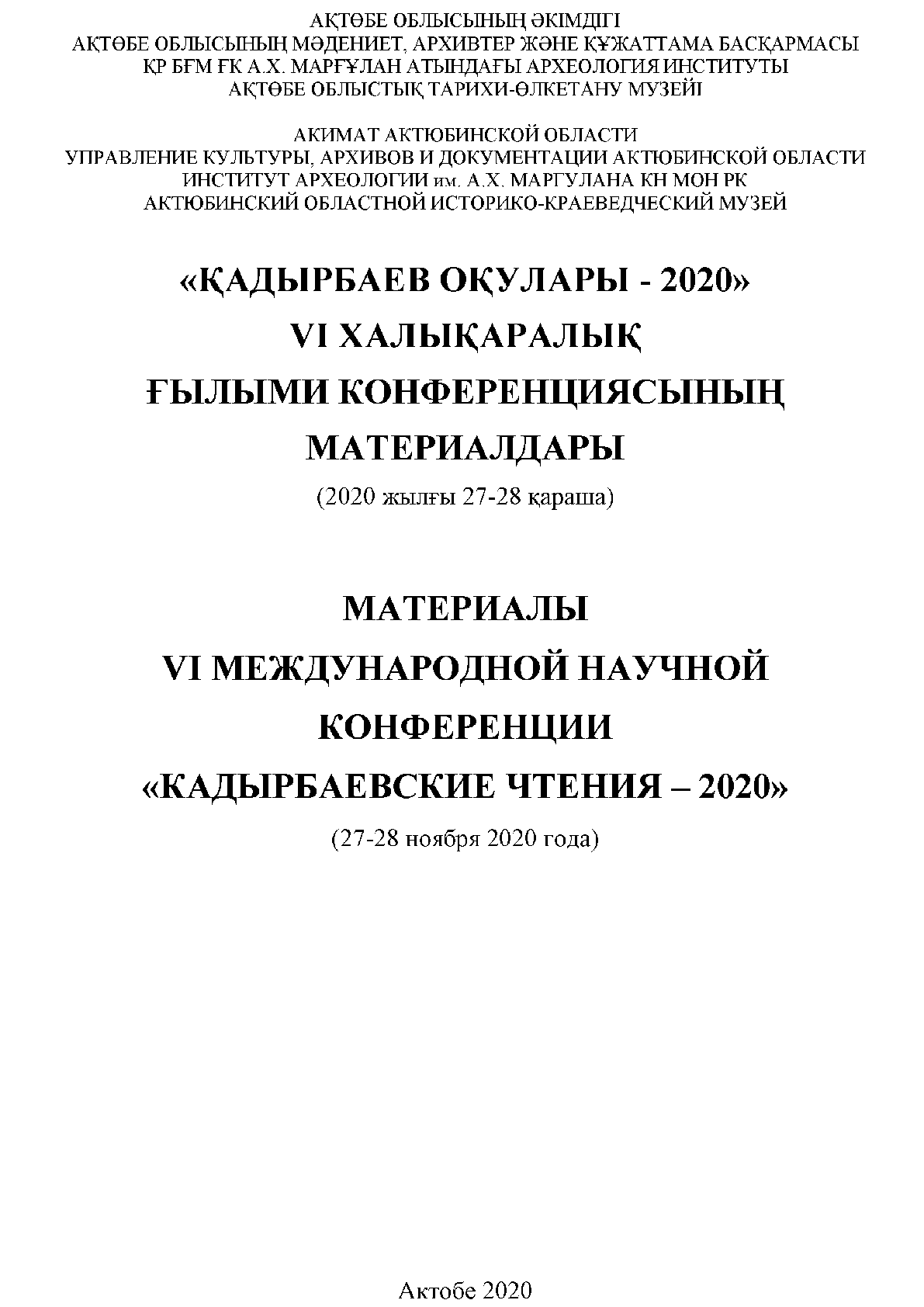 Кайдаров , А. У. Преемственность антропоморфных тюркских традиций в надмогильных стелах мусульманских погребений Актюбинской области [Текст] / А. У. Кайдаров // Кадырбаевские чтения – 2020: материалы VI международной научной конференции, (Актобе, 27-28 ноября, 2020 г.). - 2020. - Актобе. - С. 212-215. - Библиогр.: с. 214-215 ISSN<br>