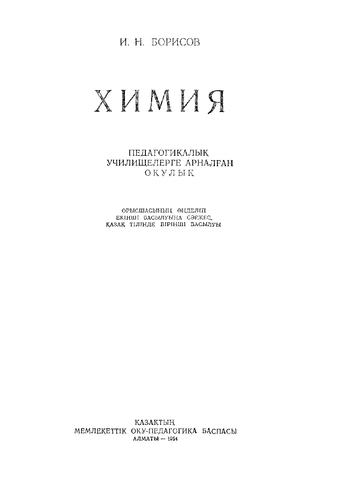 Химия [Мәтін] : педагогикалық училищелерге арналған оқулық / И. Борисов ; [редакциясын басқарған Б. Беремжанов]. – Орысшасының өңделіп екінші басылуына сәйкес қазақ тілінде бірінші басылуы .. – Алматы : Қазақтың мемлекеттік оқу-педагогика баспасы, 1954. - 228 б., суретті; . . – 3000 дана