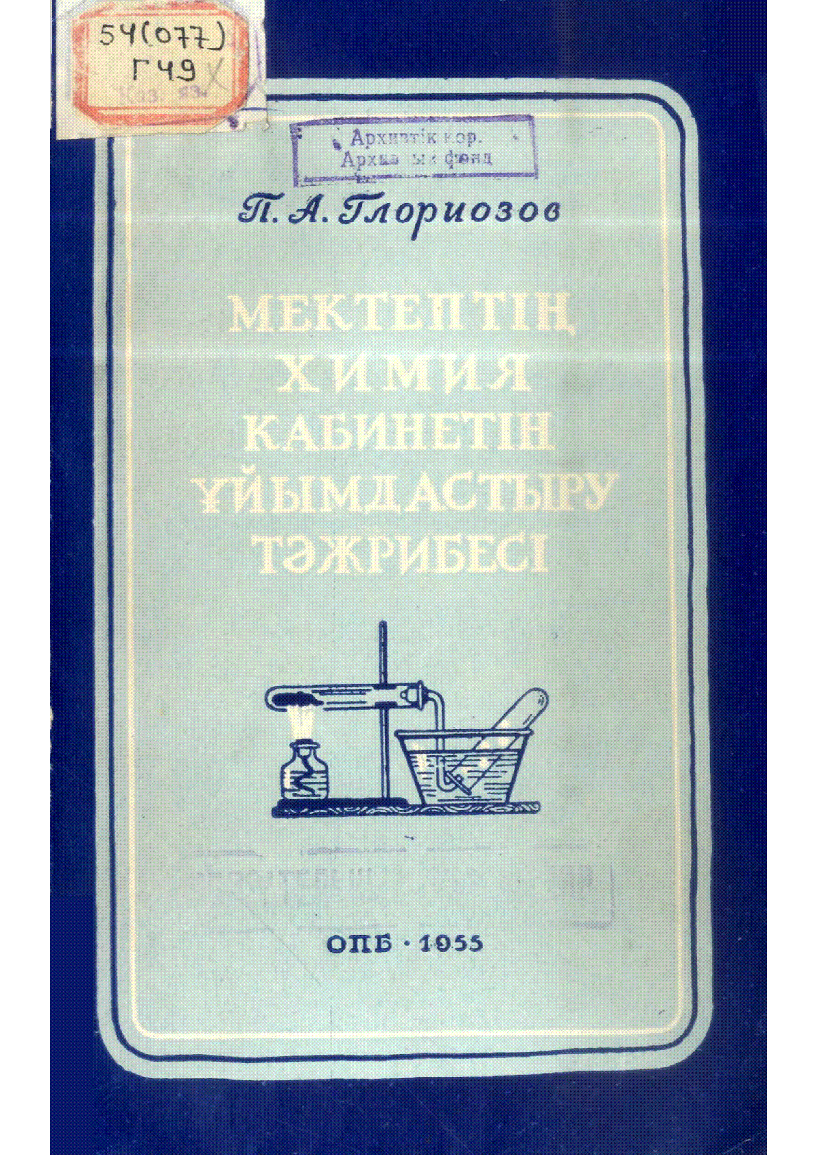 Мектептің химия кабинетін ұйымдастыру тәжрибесі [Мәтін] / П. Глориозов ; [аударған М. Ятаев ; редактор: М. Сатекова, С. Рамазанов]... – Алматы : Қазақтың мемлекеттік оқу-педагогика баспасы, 1956. - 181, [2] б. . – Ғылыми-көпшілік әдебиеттер: 181-182 б. . – 2000 дана