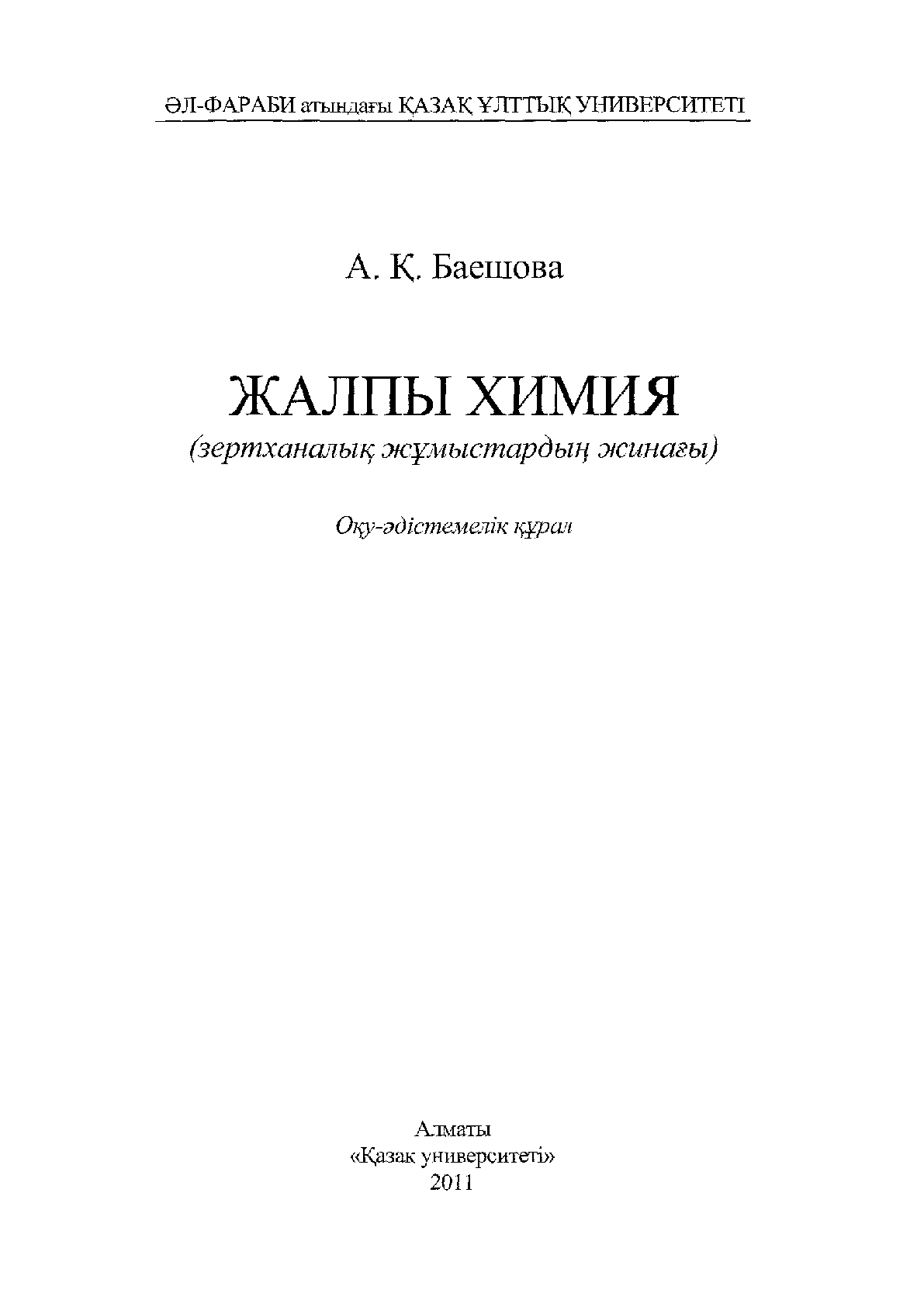 Жалпы химия [Мәтін] : (зертханалық жұмыстардың жинағы) : оқу құралы / А. Баешова ; Әл-Фараби атындағы Қазақ ұлттық университеті... – Алматы : Қазақ университеті, 2011. - 90, [1] б. . – Пайдаланған әдебиеттер: 90 б. . – 500 дана – ISBN 978-601-247-333-9