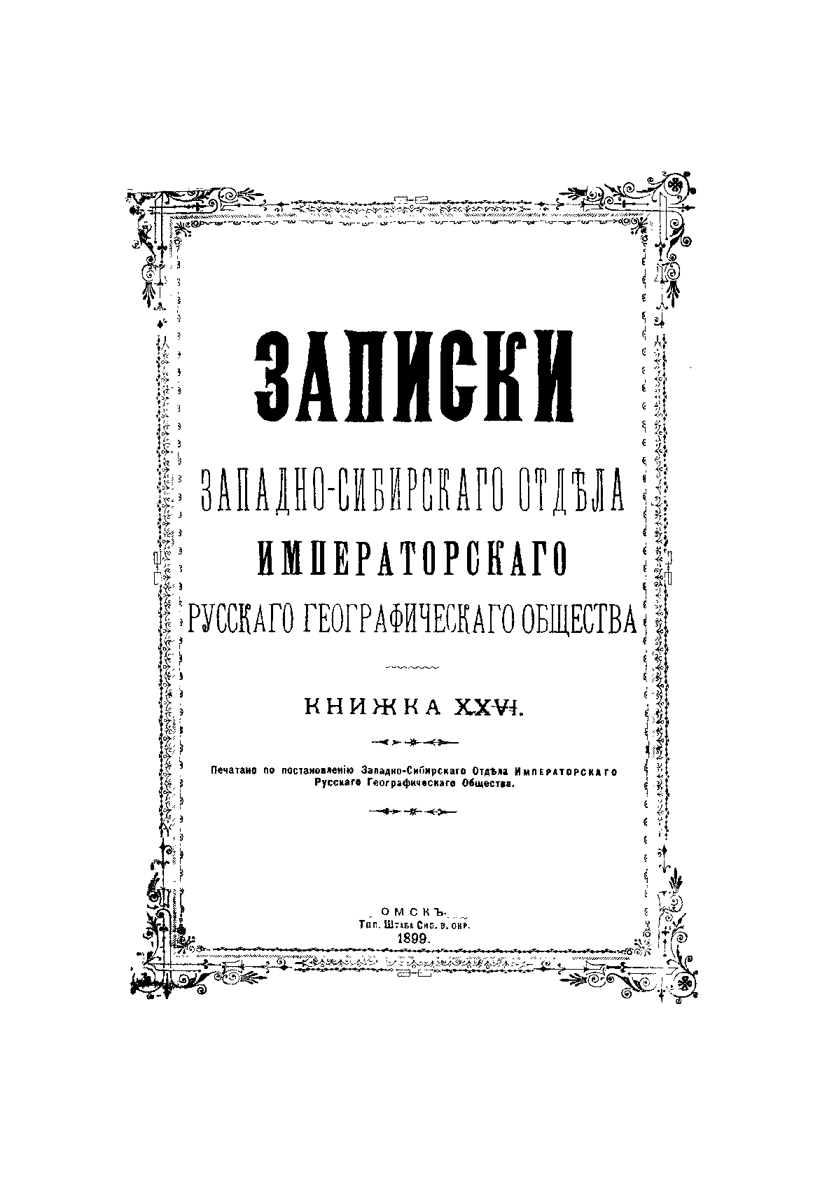 Записки Западно-Сибирского отдела Императорского Русского географического общества [Текст] / ... – Омск : Типография штаба Сибирского военного округа, 1899. - с. 5-8– (Записки Западно-Сибирского отдела Императорского Русского географического общества. ; Книга 26- Содержание: Заседание общего собрания 8 марта 1893, № 25. Заседание распорядительного комитета 8 марта 1893, № 26 . . – [б. т.]