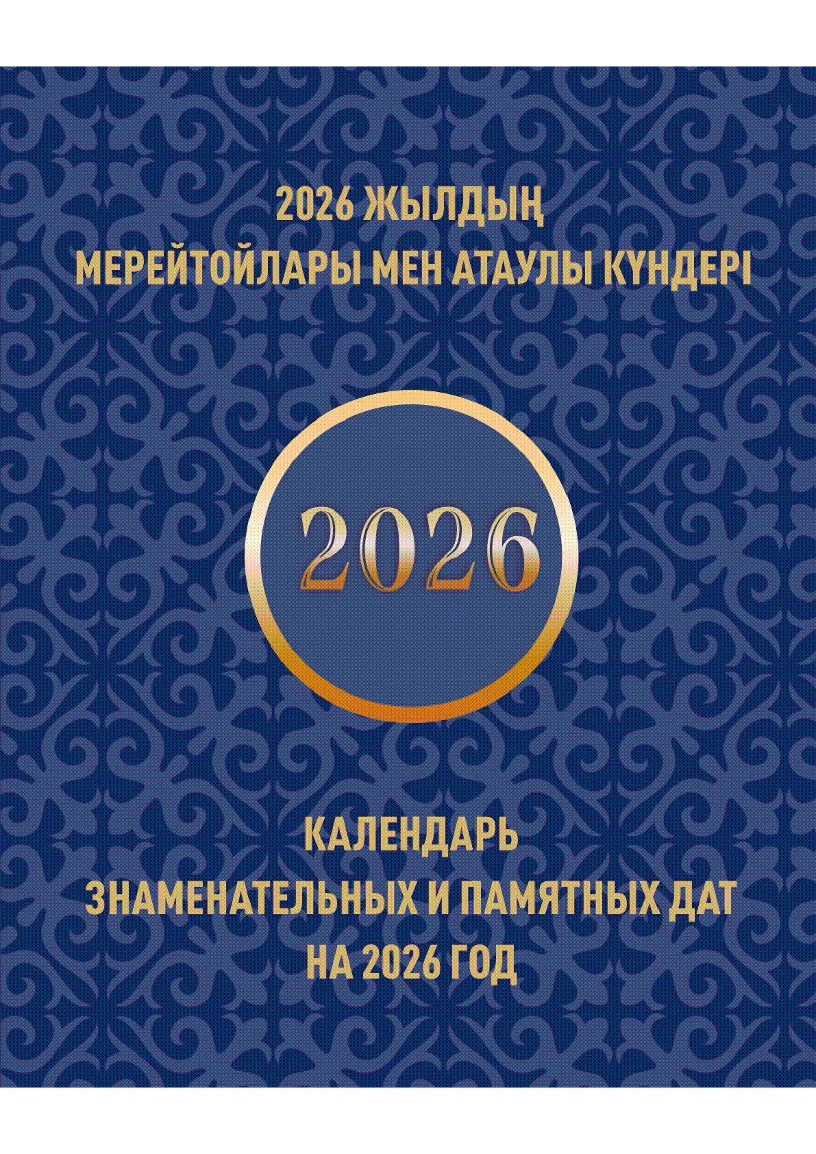 Қазақстан Республикасының 2026 жылы аталып өтетін мекемелердің, ұйымдардың және белгілі қайраткерлерінің мерейтойлық күнтізбесі = Календарь знаменательных и памятных дат на 2026 год [Мәтін] / ; Қазақстан Республикасының Ұлттық академиялық кітапханасы ; құрастырған: Б. С. Ташимова, А. Е. Құсайынова... – Астана : [б. ж.], 2025. - 183 б., суретті; - Мәтін қазақ, орыс тілдерінде . . – [т. ж.]