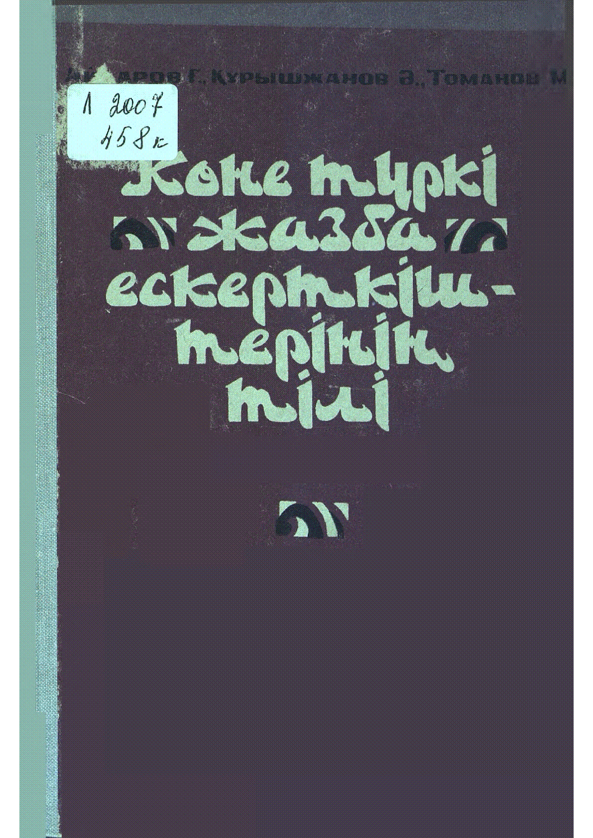 Көне түркі жазба ескерткіштерінің тілі [Мәтін] : университет пен педагогтық институттардың филология факультеттеріне арналған оқу құралы / Ғ. Айдаров Томанов, М. Құрышжанов, Ә. ... – Алматы : Мектеп, 1971. - 272 б. - Шора Сарыбаев қоры. - Мырзатай Жолдасбеков қоры . . – 2000 дана (мұқ.) : 50 тг.