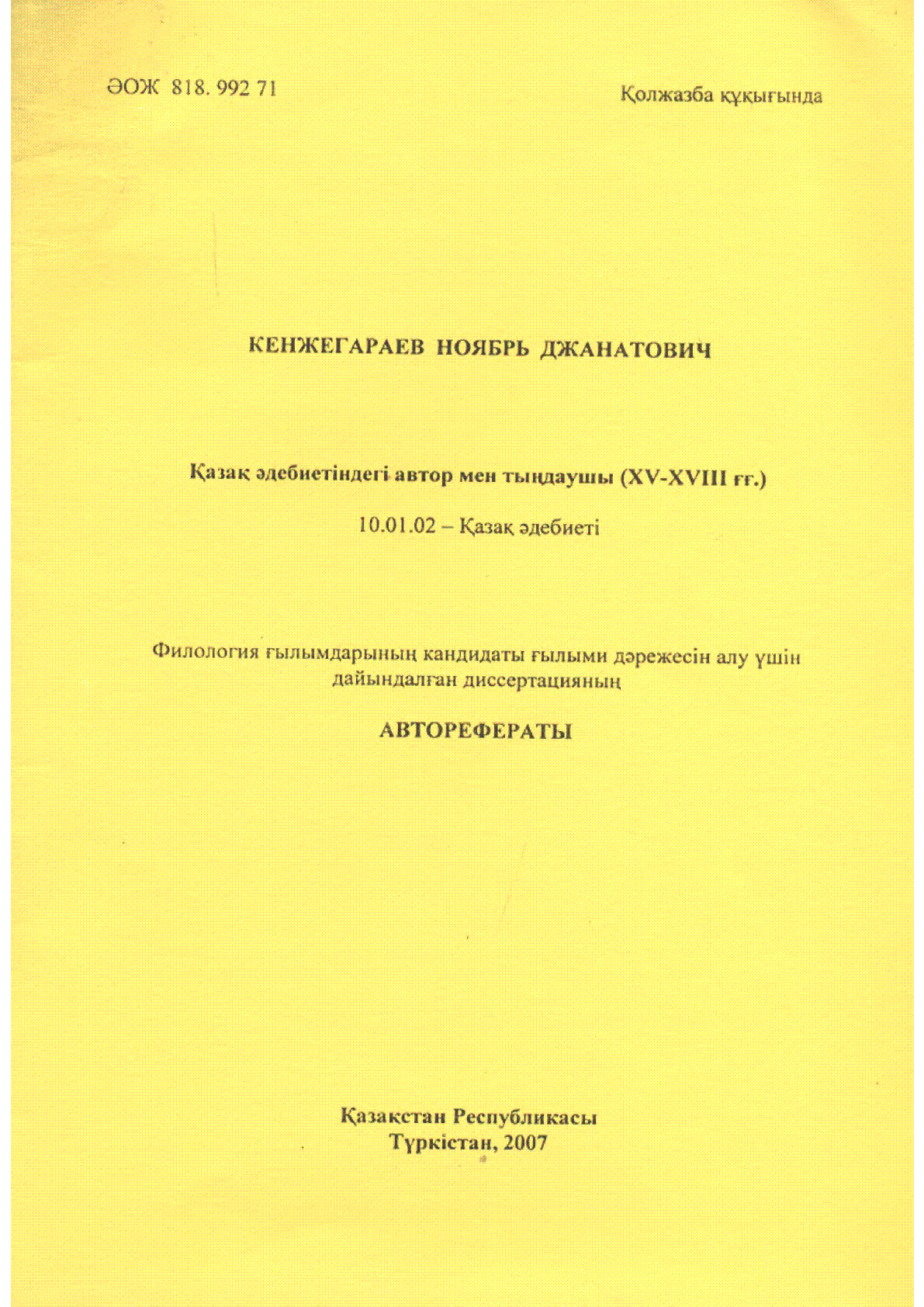Қазақ әдебиетіндегі автор мен тыңдаушы (XV-XVIII ғғ.) [Мәтін] : филология ғылым. канд. ғылыми дәреж. алу үшін дайындал. дисс. авторефераты мамандығы бойынша 10.01.02 - қазақ әдебиеті / Н. Д. Кенжегараев ; [ғыл. жетекші М. Мырзахметұлы]; М. О. Әуезов атын. әдебиет және өнер ин-ты... – Түркістан : [б. ж.], 2007. - 24, [6] б . – Библиогр.: 25-26 б. . – 100 дана