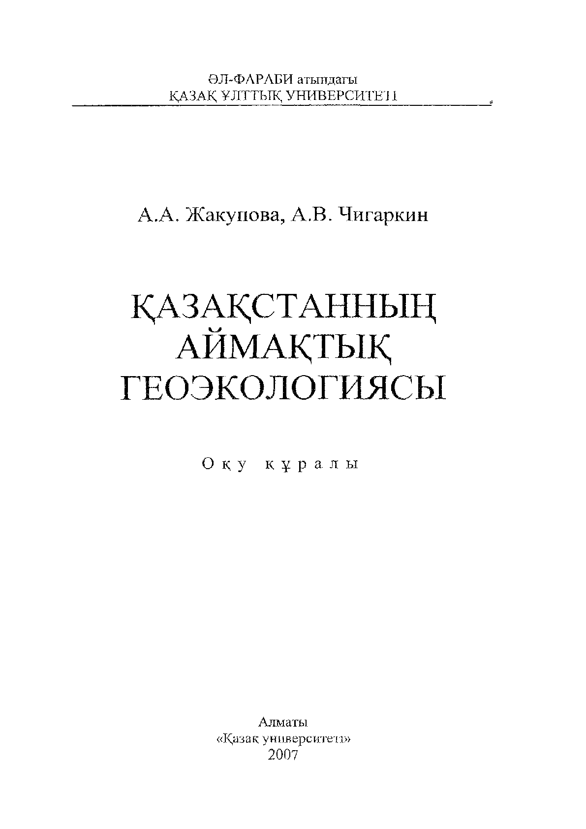 Қазақстанның аймақтық геоэкологиясы [Мәтін] : оқу құралы / А. А. Жакупова А. В. Чигаркин ; Әл-Фараби атындағы Қазақ ұлттық университеті... – Алматы : Қазақ университеті, 2007. - 201 б., кесте; . – Қолданылған әдебиеттер: 159-162 б. . – 500 дана – ISBN 9965-30-274-Х : 507 тг.