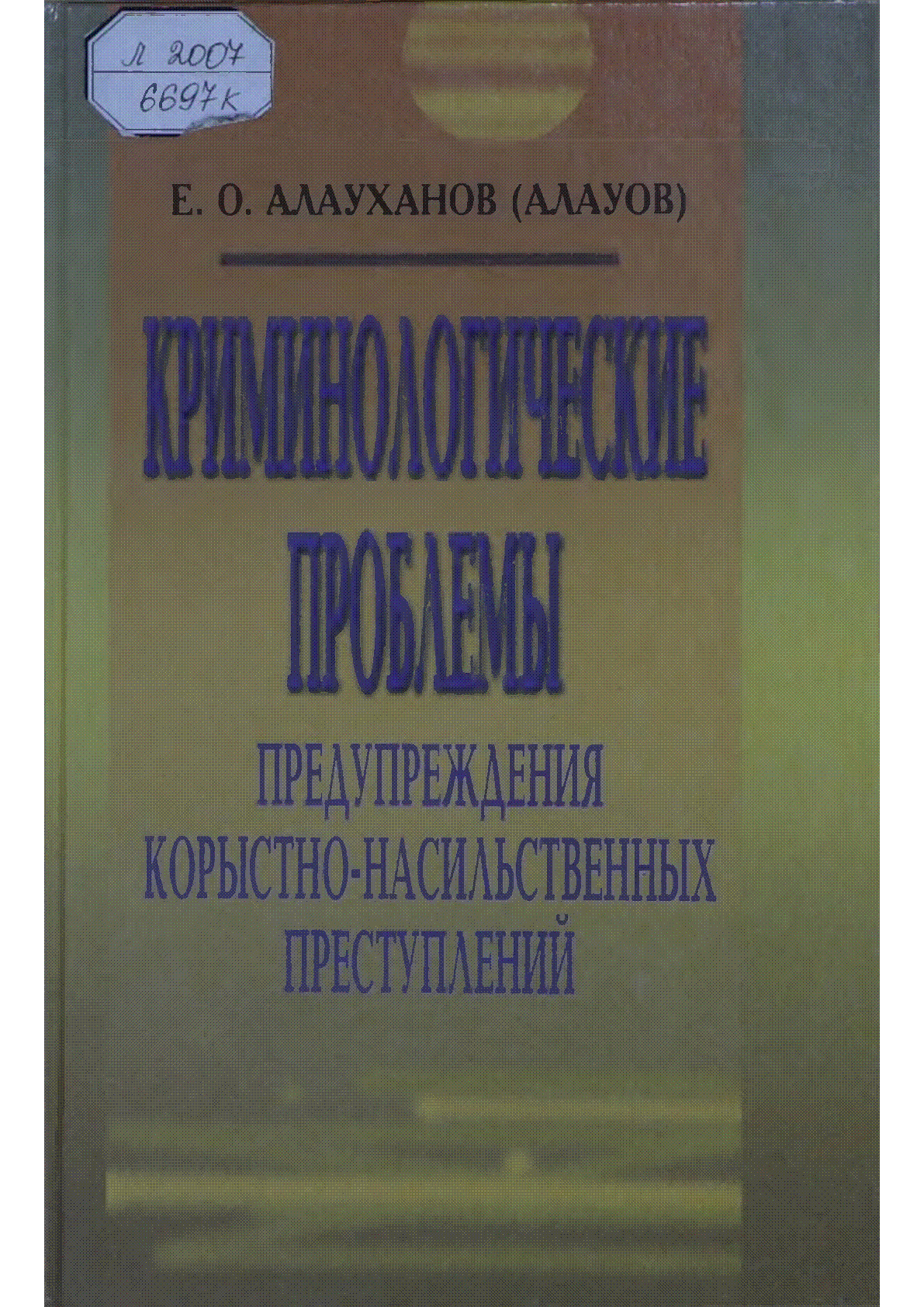 Криминологические проблемы предупреждения корыстно-насильственных преступлений [Текст] / Е. О. Алауханов ... – Алматы : Өркениет, 2002. - 287 c. - Авт. на тит. л.: Есберген Оразович Алауханов (Алауов) . – Библиогр.: с. 272-282 . – 1000 экз. – ISBN 9965-502-26-9 (в пер.) : 450 тг.