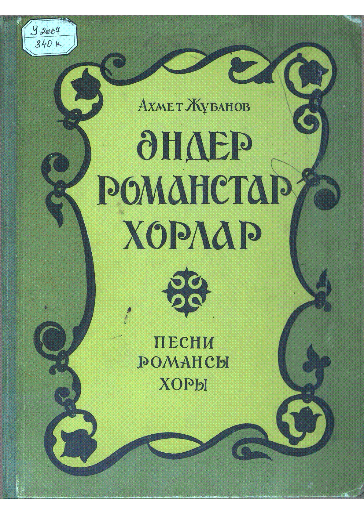 Әндер, романстар, хорлар [Ноталар] / А. Жұбанов ... – Алматы : Қазақтың мем. көркем әдебиет баспасы, 1957. - 128 б., сурет.; - Мәтін қазақ және орыс тілдерінде қатар . .