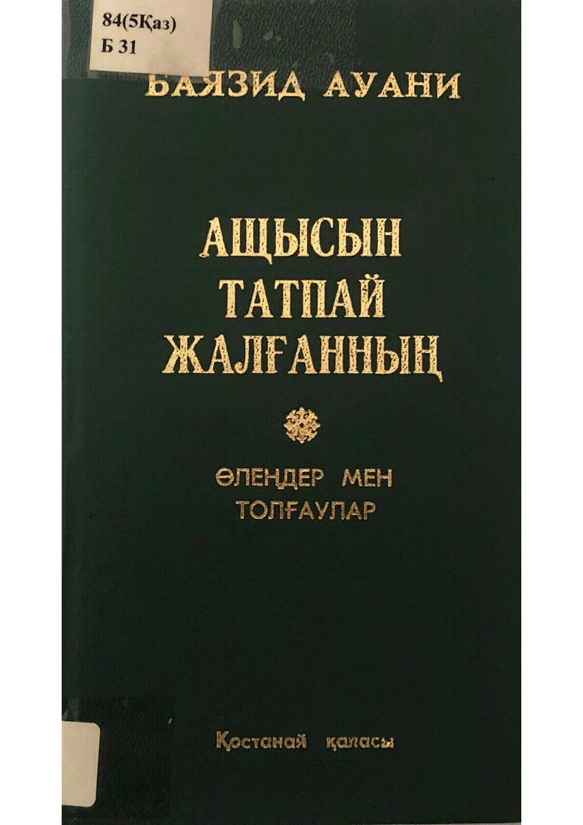 Ащысын татпай жалғанның [Мәтін] : өлеңдер мен толғаулар / А. Баязид ... – Қостанай : [б. ж.], 2000. - 99, [1] б. . . – 300 дана – 5-7667-4812-4 (мұқ.)