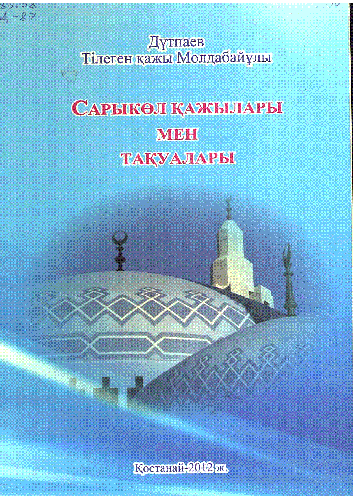 Сарыкөл қажылары мен тақуалары [Мәтін] / Дүтпаев, Тілеген қажы Молдабайұлы ... – Қостанай : [б. ж.], 2012. - 128 б., сурет.; . . – 100 дана – 978-601-227-145-4 : [б. ж.]