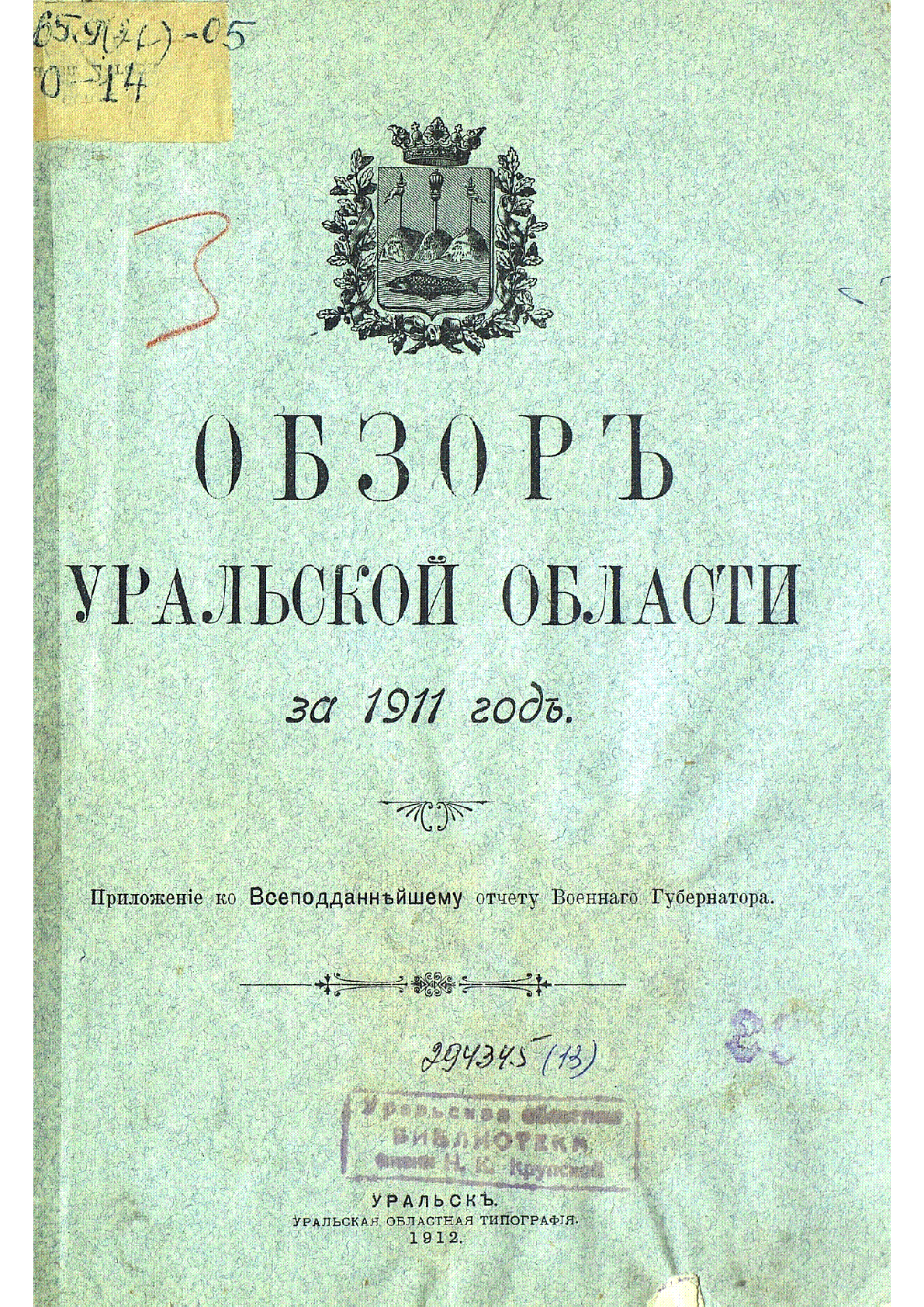 Обзор Уральской области за 1911 год [Текст] : Приложение к Всеподданнейшему отчету Военного Губернатора / ... – Уральск : Уральская обл. тип., 1912. - II, 74 с., [11] л. табл., табл.; - Загл. с обл. . .