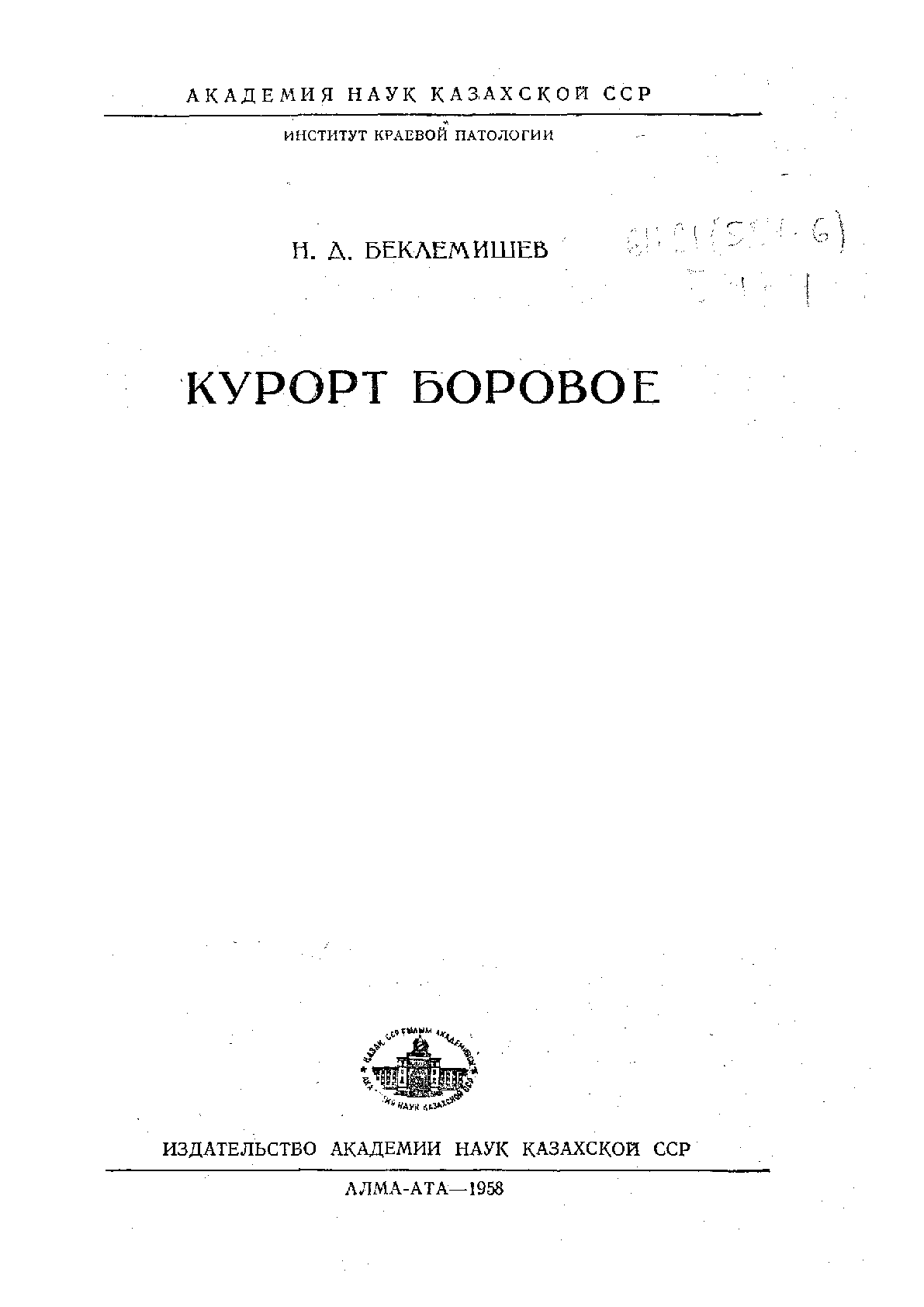 Курорт Боровое [Текст] / Н. Д. Беклемишев ... – Алма-Ата [Алматы] : Издательство Академии Наук Казахской ССР, 1958. - 159 с., ил.; . – Указатель литературы по Боровому: с. 150-156. - Приложение. Показания и противопоказания для направления больных в санатории...: с. 157-159 . – 13400 экз. (в пер.) : 7 тг.