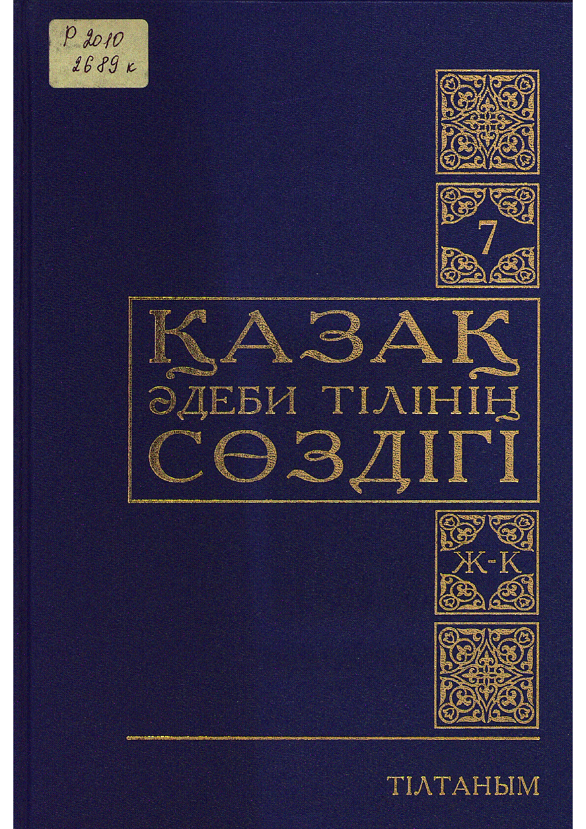 Қазақ әдеби тілінің сөздігі [Мәтін] : Он бес томдық ; Қазақстан Республикасы Білім және ғылым министрлігі А. Байтұрсынұлы атындағы тіл білімі институты ; сөздікті құраст.: Б. Момынова [ж.б.] .- Алматы : Арыс , 2007. – Тілтаным. – 9965-17-347-8, – 3000 дана . – 9965-17-537-3 (7-т.) (мұқ.) - Мәдени мұра мемлекеттік бағдарламасы бойынша ; Шора Сарыбаев қоры . 7-том . Ж-К– 752 б. (мұқ.)