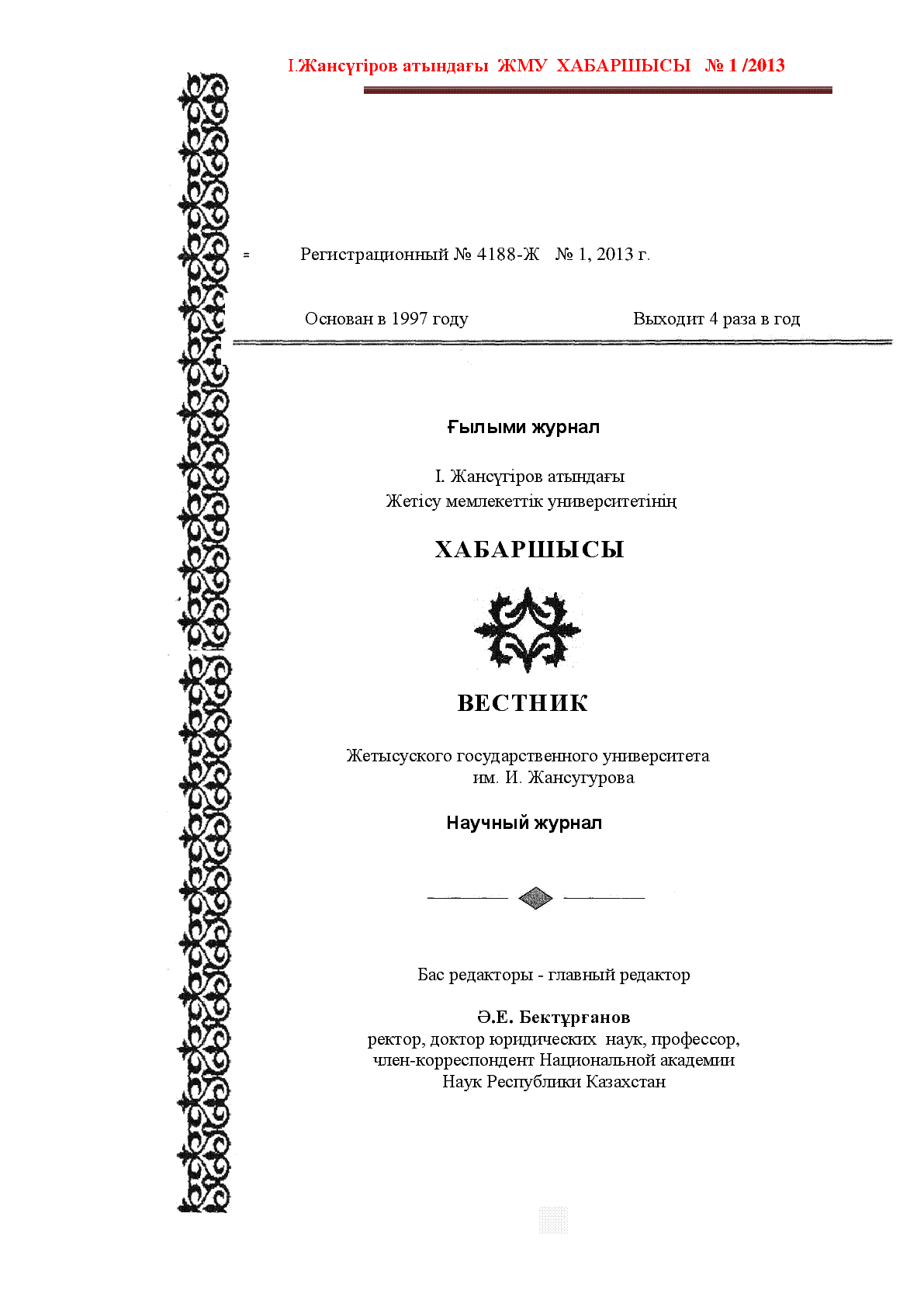 І. Жансүгіров атындағы Жетісу мемлекеттік университетінің хабаршысы = Вестник Жетысуского государственного университета им. И. Жансугурова [Text] : ғылыми журнал : 1997 жылы шыға бастады ; бас ред. Ә. Е. Бектұрғанов. – Талдықорған : [б. ж.], 2013. - .– 550 дана.– жылына төрт рет шығады. – 1813-1123. - 550 дана