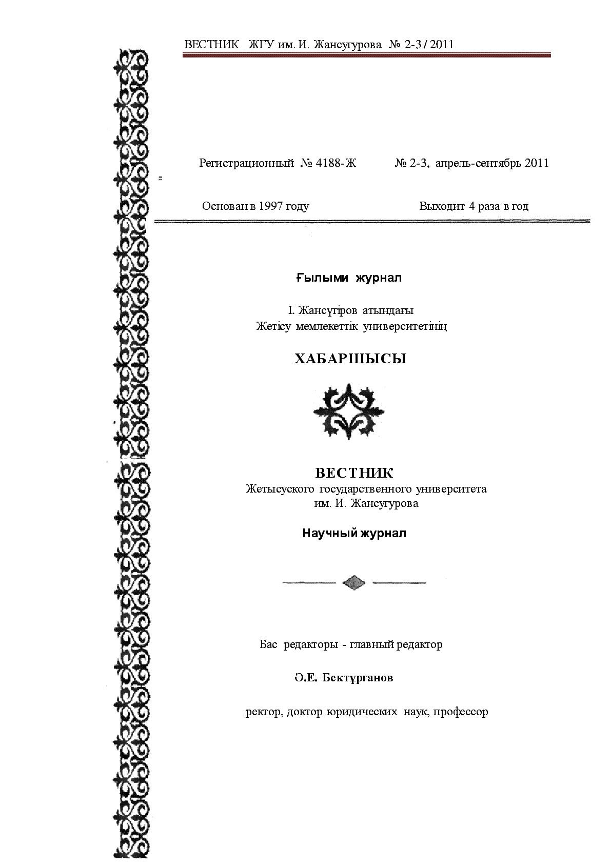 І. Жансүгіров атындағы Жетісу мемлекеттік университетінің хабаршысы = Вестник Жетысуского государственного университета им. И. Жансугурова [Text] : ғылыми журнал : 1997 жылы шыға бастады ; бас ред. Ә. Е. Бектұрғанов. – Талдықорған : [б. ж.], 2011. - .– 550 дана.– Жылына төрт рет шығады. – 1813-1123. - 550 дана