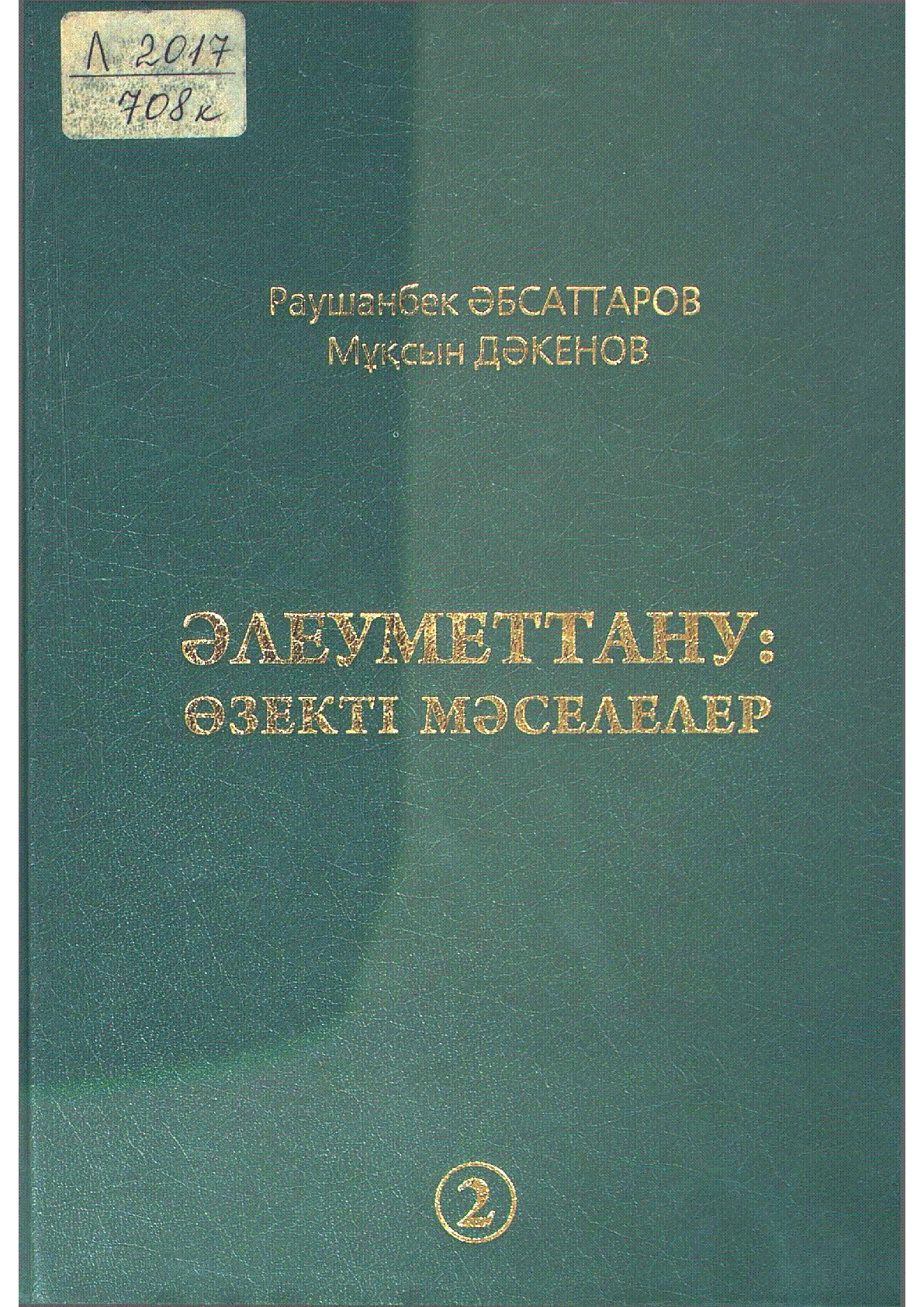 Әлеуметтану: өзекті мәселелер [Мәтін] : (екі томдық оқу құралы) / Р. Б. Әбсаттаров, М. Дәкенов- Алматы : Қарасай , 2013.– 1600 дана . – 978-601-7049-21-8, 978-601-7049-24-9 (2-т.)(мұқ.) 2-т. .– 407 б. (2-т.)(мұқ.) : 45 тг.