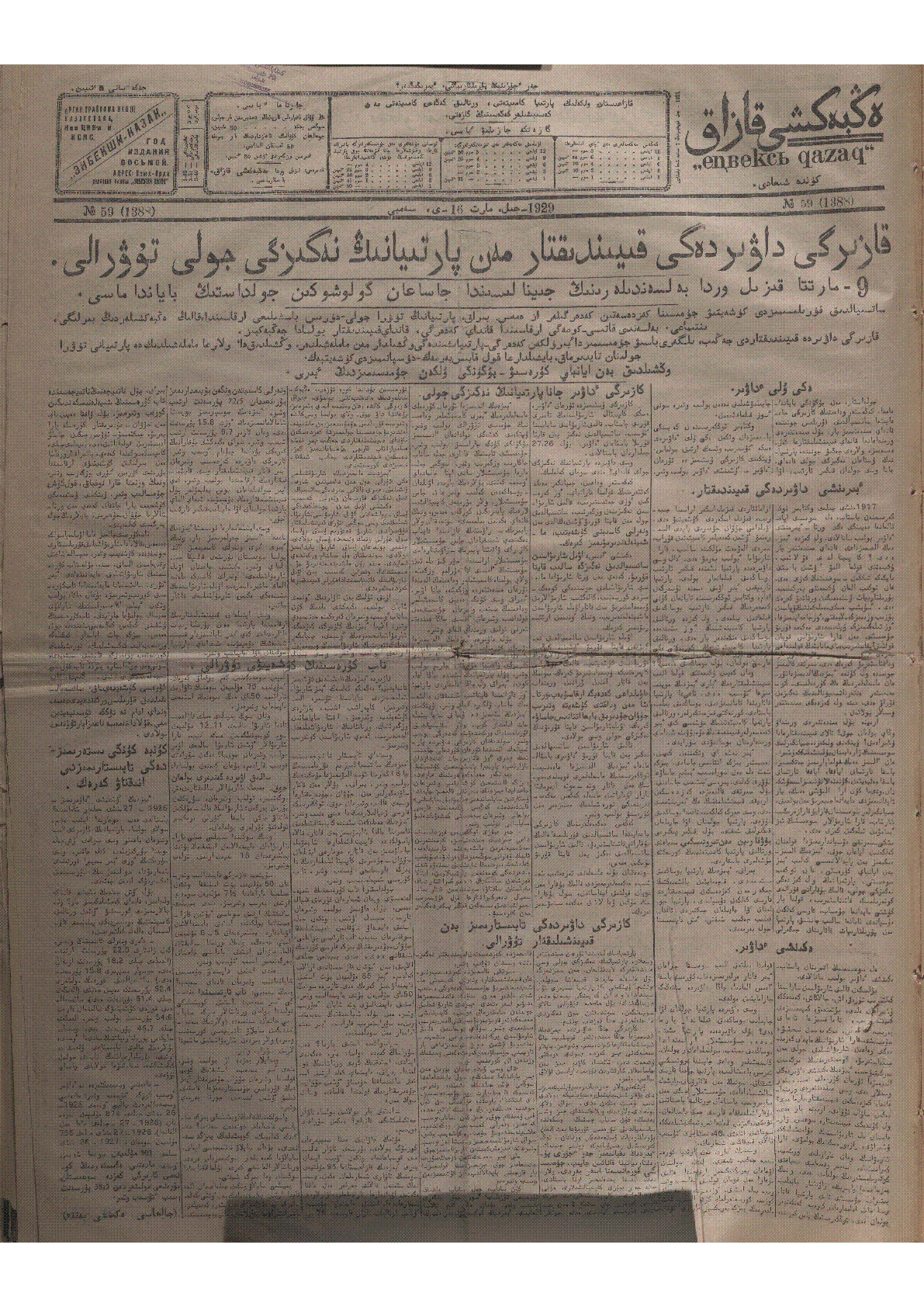 Еңбекші қазақ. 1929 ж. : 16-март, 1929 ж.. – Қызыл-Орда : Казгосиздат, 1929. - .– [т. ж.].– күнде шығады. № 59(1388). - [т. ж.]