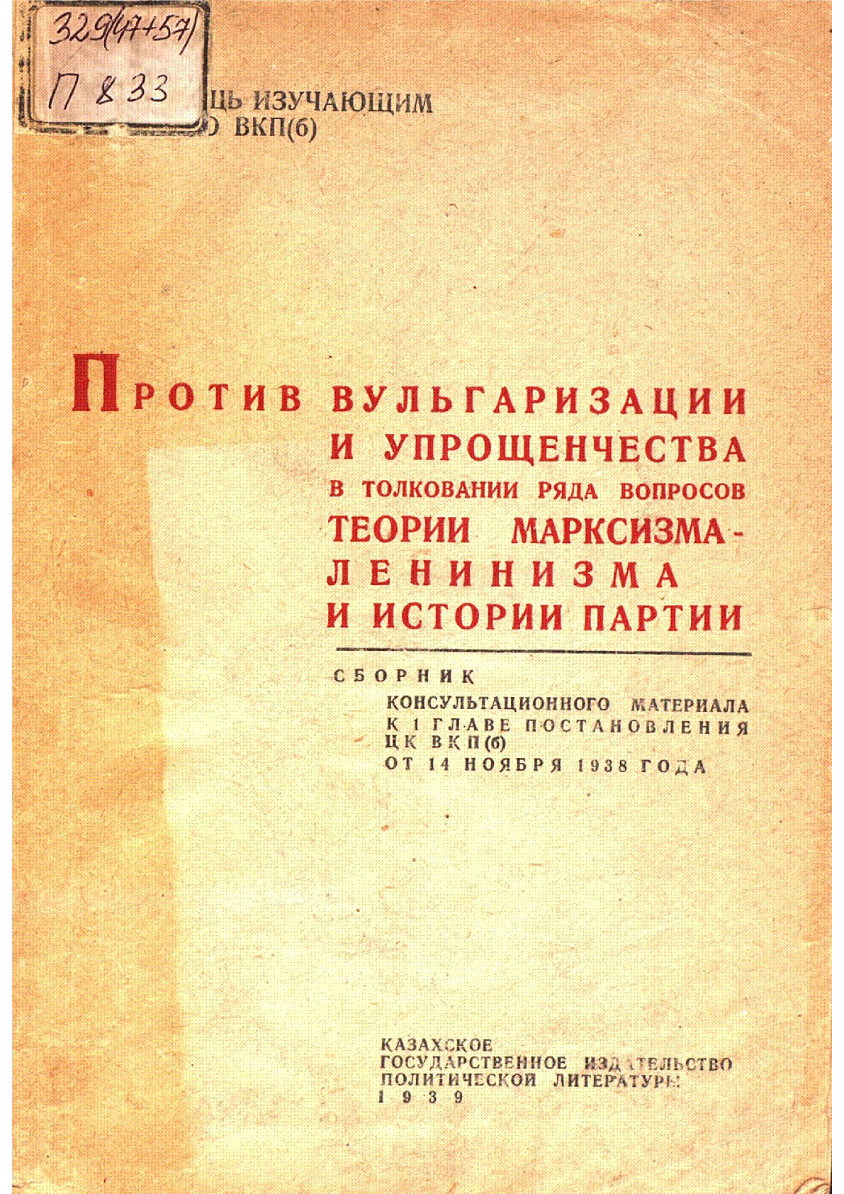 Против вульгаризации и упрощенчества в толковании ряда вопросов теории марксизма-ленинизма и истории партии [Текст] : сборник консультационного материала к I разделу постановления ЦК ВКП(б) от 14 ноября 1938 года / ... – Алма-Ата : Казгосполитиздат, 1939. - 71, [2] с.– (В помощь изучающим историю ВКП(б). . . – 15000 экз. : 10 тг.
