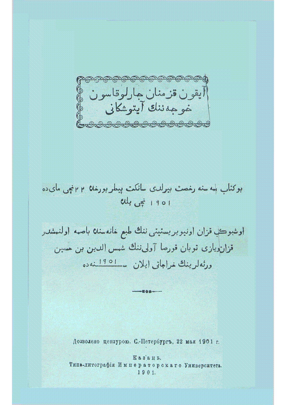 Айқын қыз менен Жарылқасын қожаның айтысқаны = آيقون قز منان جارلوقاسون خوجهننك آيتوشكانى [Text] / ... – Қазан : Тип. Императорского Университета, 1901. - 12 б. - Мәтін татар тілінде араб графикасымен жазылған . . – [т. ж.] : 10 тг.