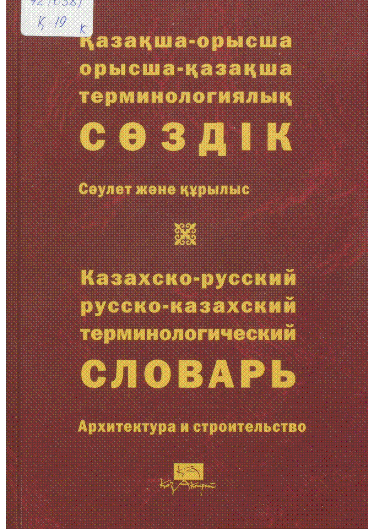 Қазақша-орысша, орысша-қазақша терминологиялық сөздік [Мәтін] – Педагогикалық Ғылымдар Академиясы ; А. Байтұрсынов атын. Тіл білімі ин-ты ; жалпы ред. М.Б. Қасымбеков ; жоба жет. А.Қ. Құсайынов ; авт. ұжым: Ә.Ш. Тәттіғұлов т.б. ,- Астана : ҚАЗақпарат , 2014.– 4000 дана . – 978-601-03-0310-2 - Қаз., орыс тіл. . 9-том . Сәулет және құрылыс : 10000-нан астам термин– 448 бет