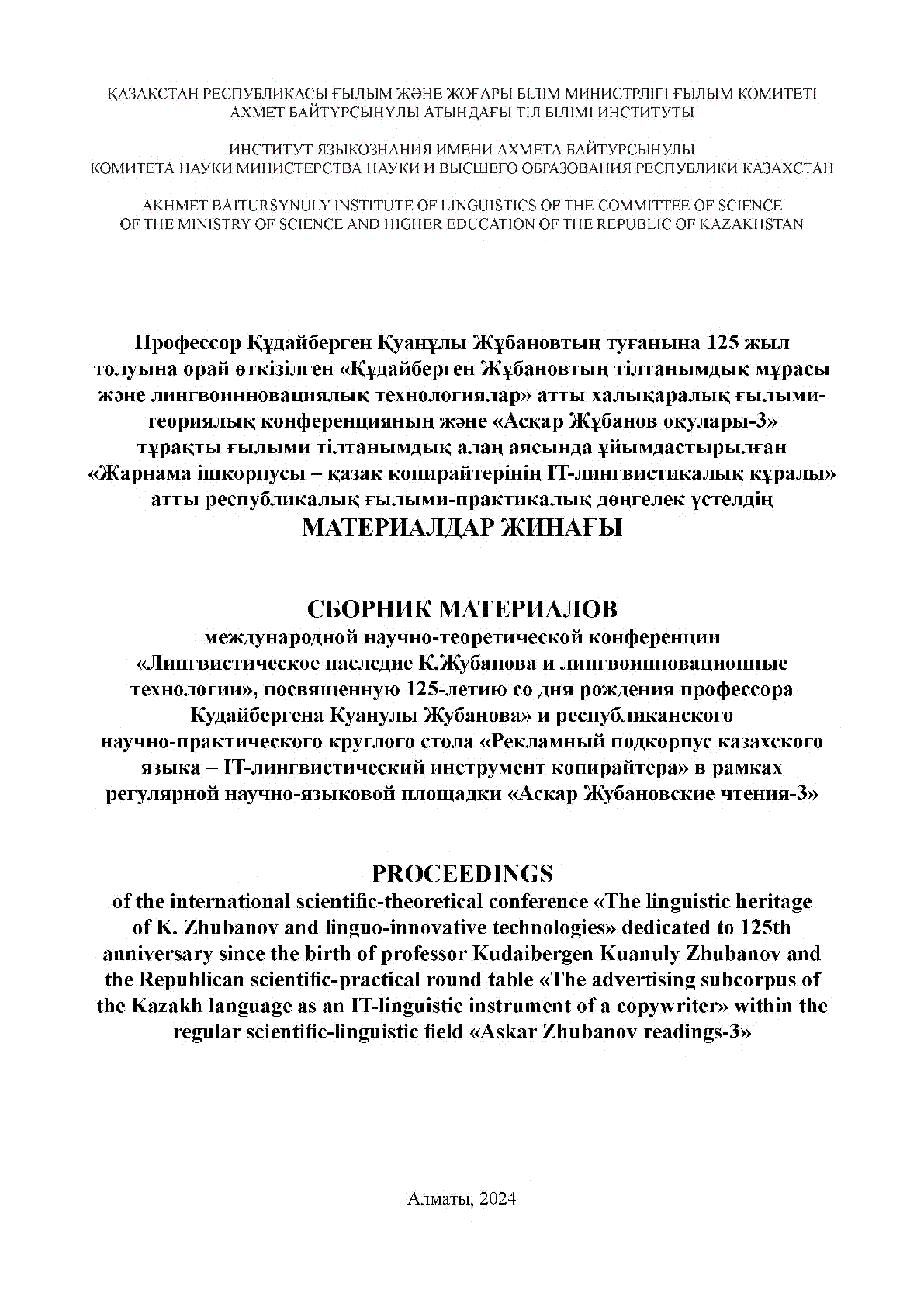 Профессор Құдайберген Қуанұлы Жұбановтың туғанына 125 жыл толуына орай өткізілген «Құдайберген Жұбановтың тілтанымдық мұрасы және лингвоинновациялық технологиялар » атты халықаралық ғылыми-теориялық конференцияның және «Асқар Жұбанов оқулары-3» тұрақты ғылыми тілтанымдық алаң аясында ұйымдастырылған «Жарнама ішкорпусы – қазақ копирайтерінің IT-лингвистикалық құралы» атты республикалық ғылыми- практикалық дөңгелек үстел материалдары = Сборник материалов международной научно-теоретической конференции «Лингвистическое наследие К.Жубанова и лингвоинновационные технологии», посвященную 125-летию со дня рождения профессора Кудайбергена Куанулы Жубанова» и республиканского научно-практического круглого стола «Рекламный подкорпус казахского языка – IT-лингвистический инструмент копирайтера» в рамках регулярной научно-языковой площадки «Аскар Жубановские чтения-3» = Proceedings of the international scientific-theoretical conference «The linguistic heritage of K. Zhubanov and linguo-innovative technologies» dedicated to 125th anniversary since the birth of professor Kudaibergen Kuanuly Zhubanov and the Republican scientific-practical round table «The advertising subcorpus of the Kazakh language as an IT-linguistic instrument of a copywriter» within the regular scientific-linguistic field «Askar Zhubanov readings-3» [Мәтін] / ; Қазақстан Республикасы Ғылым және жоғары білім министрлігі ; Ахмет Байтұрсынов атындағы Тіл білімі институты ; бас редактор А. Фазылжан ; редакция алқасы: Н. Уәли, Р. Шойбеков [ж. б.]... – Алматы : «ЖК Асыл», 2024. - 183 б. - Мәтін қазақ, орыс, ағылшын тілдерінде . – Пайдаланған әдебиеттер тізімі мақала соңында . – 50 дана – ІSBN 978-601-7171-25-4