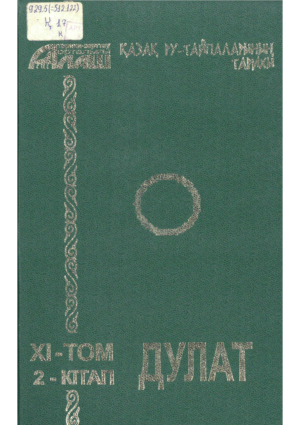 Қазақ ру-тайпаларының тарихы [Мәтін] ; жобаның авт.: Х. М. Ғабжалилов ; "Алаш" тарихи-зерттеу орталығы- Алматы : "Алаш" тарихи-зерттеу орталығы , 2008.– 1000 дана . – 9965-765-18-9 (мұқ.) ХІ том, 2-кітап . Дулат– 576 б., сурет. . (мұқ.)