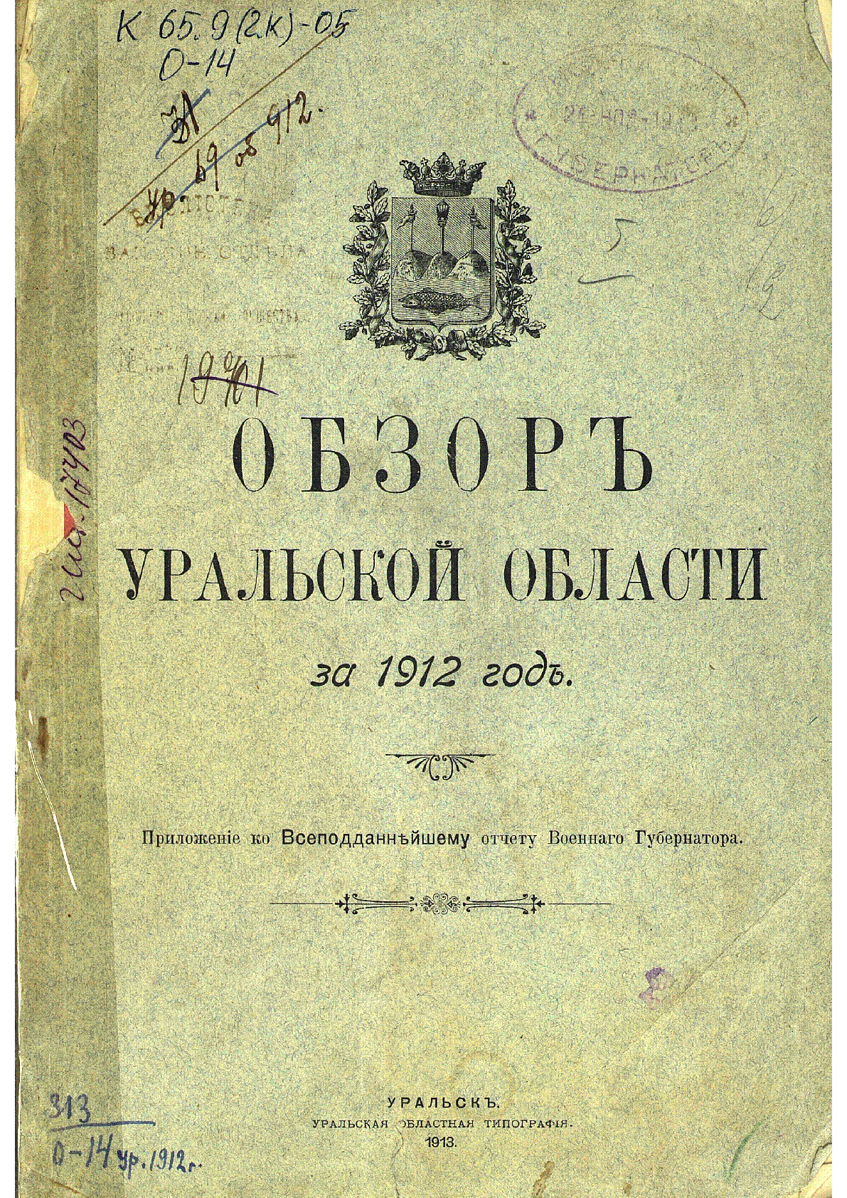 Обзор Уральской области за 1912 год [Текст] : Приложение к Всеподданнейшему отчету Военного Губернатора / ... – Уральск : Уральская обл. тип., 1913. - III, 109 с., [9] л. табл., табл.; - Загл. с обл. . .