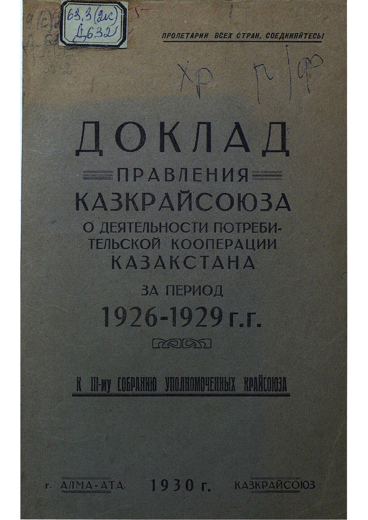 Доклад Правления Казкрайсоюза о деятельности Потребительской кооперации Казакстана за период 1926-29 г. [Текст] : к III-му Собранию Уполномоченных Крайсоюза / ... – Алма-Ата : Казкрайсоюз, 1930. - 119, [2] с., табл.; . .
