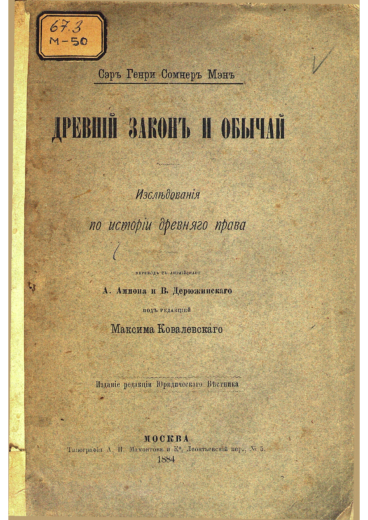 Древній законъ и обычай [Текст] : Изслъдованія по исторіи древняго права / Г. С. Мэн . – Изд. редакціи Юридическаго Въстника .. – Москва : Тип. А. И. Мамонтова и К, 1884. - 312 с. . . – [б. т.] : 30 тг.