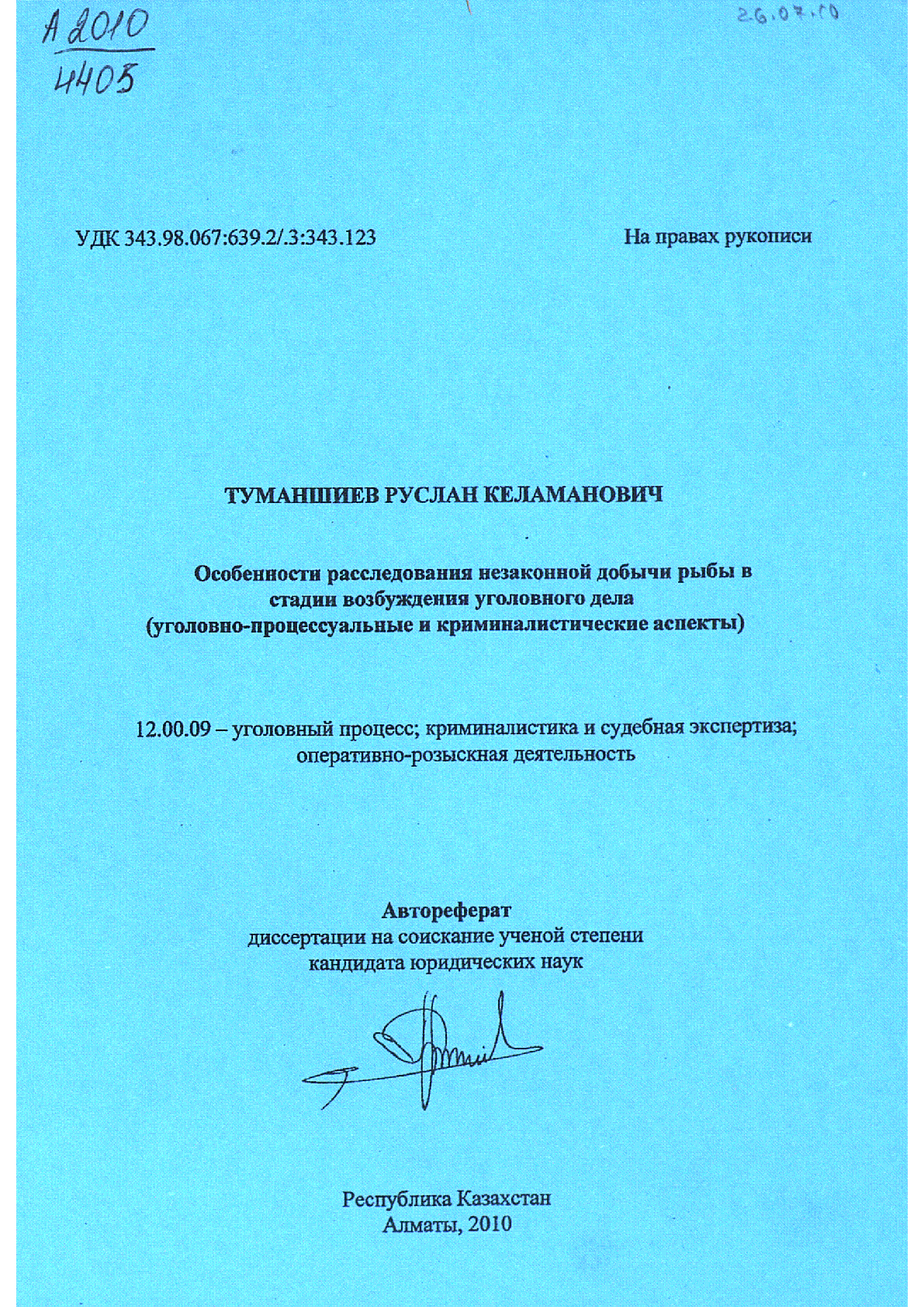 Особенности расследования незаконной добычи рыбы в стадии возбуждения уголовного дела (уголовно-процессуальные и криминалистические аспекты) : Автореферат дис. ... канд. юрид. наук : 12.00.09 / Туманшиев, Руслан Келаманович ... – Алматы : [б.и.], 2010. - 24, [4] с. . – Библиогр.: с. 24 . – 150 экз. – Не указан : [б.ц.]