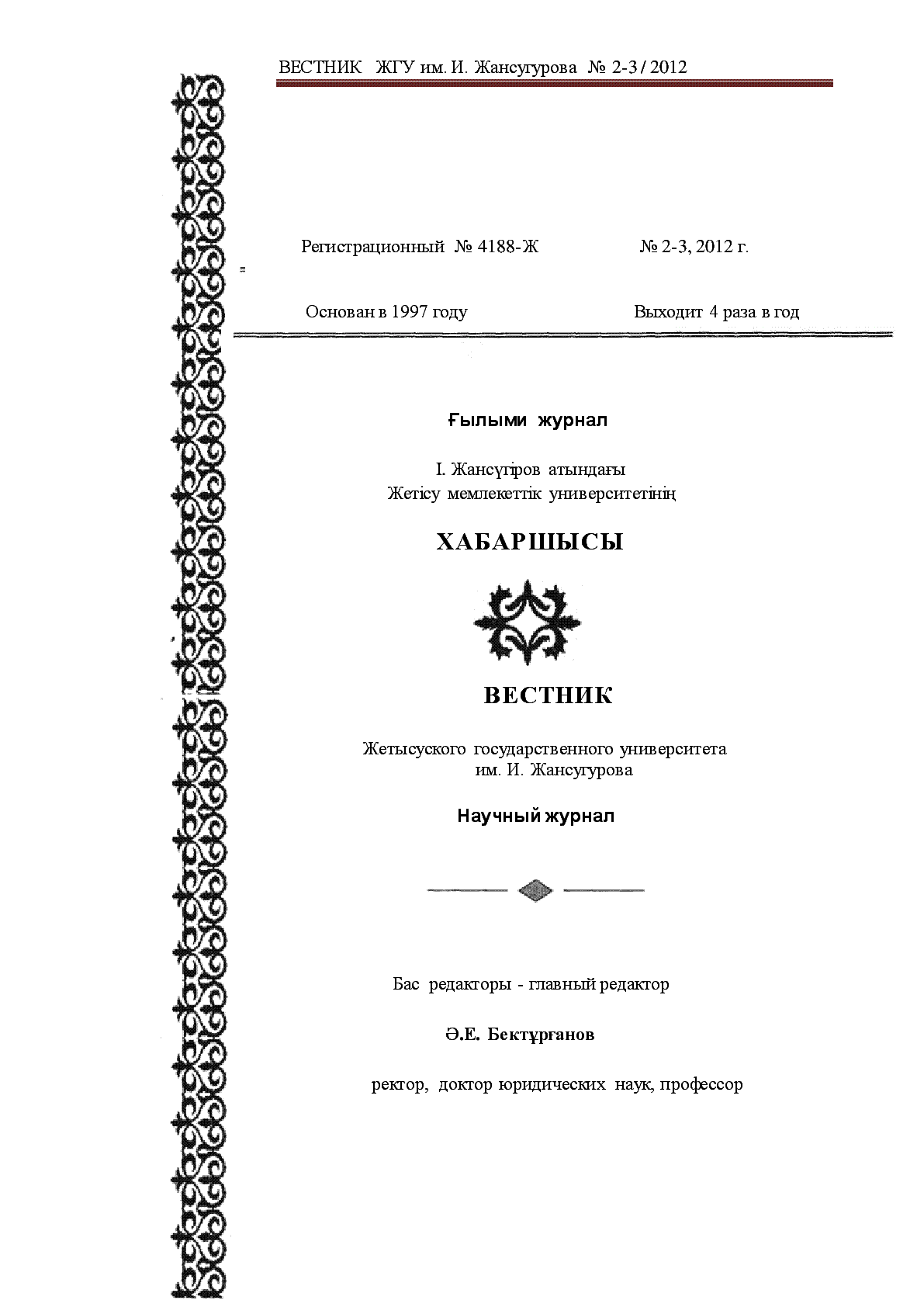 І. Жансүгіров атындағы Жетісу мемлекеттік университетінің хабаршысы = Вестник Жетысуского государственного университета им. И. Жансугурова [Text] : ғылыми журнал : 1997 жылы шыға бастады ; бас ред. Ә. Е. Бектұрғанов. – Талдықорған : [б. ж.], 2012. - .– 550 дана.– жылына төрт рет шығады. – 1813-1123. - 550 дана