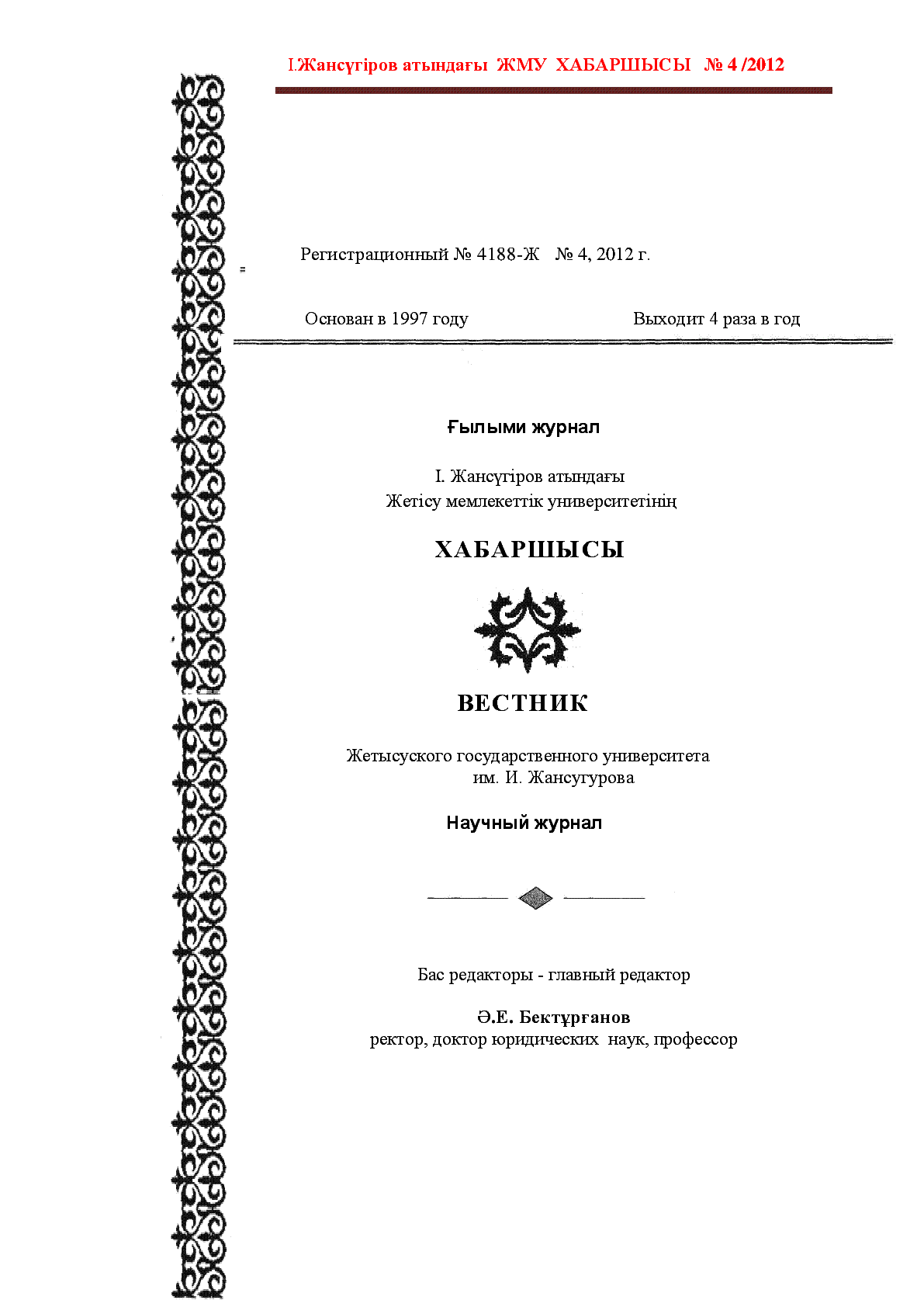 І. Жансүгіров атындағы Жетісу мемлекеттік университетінің хабаршысы = Вестник Жетысуского государственного университета им. И. Жансугурова [Text] ; бас ред. Е. Ж. Бекмұхамбетов. – Талдықорған : [б. ж.], 2012. - .– 550 дана.– жылына төрт рет шығады. – 1813-1123. - 550 дана