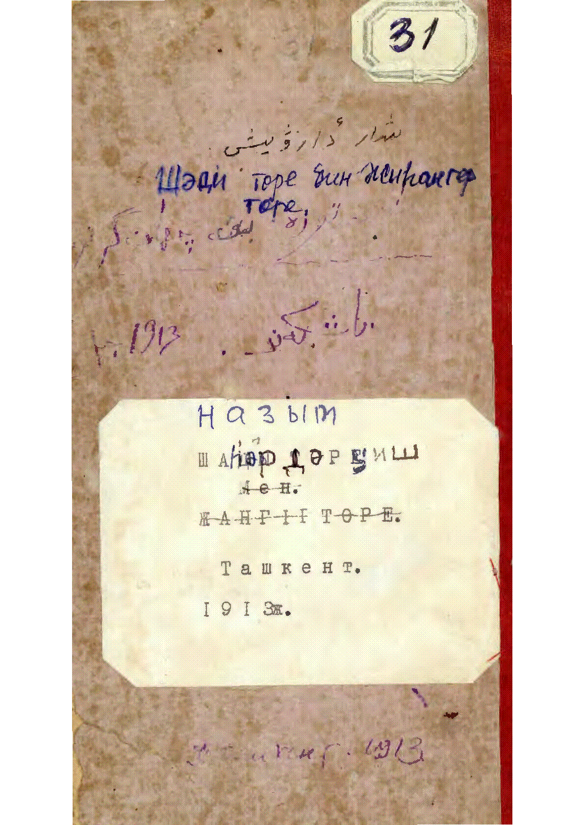 Назым чәhәр дәруиш [Мәтін] / Шади төре бин Жиhангер төре ... – Ташкент, 1913. - 172 б. - Мәтін араб графикасымен жазылған, Төрт дәруиш туралы дастан . .