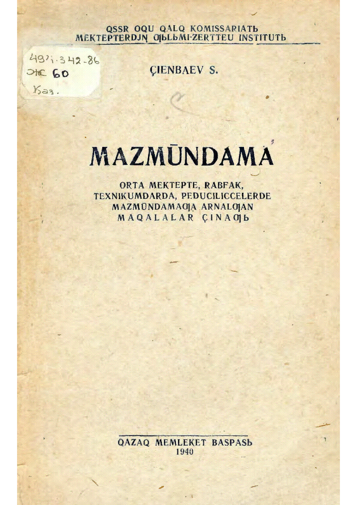 Мазмұндама [Text] : орта мектепте, рабфак, техникумдарда, педучилищелерде мазмұндамаға арналған / Жиенбаев С. ... – Алма-Ата : Қазақ мемлекеттік баспасы, 1940. - 64 бет - Латын графикасымен. . . – 2 000 дана