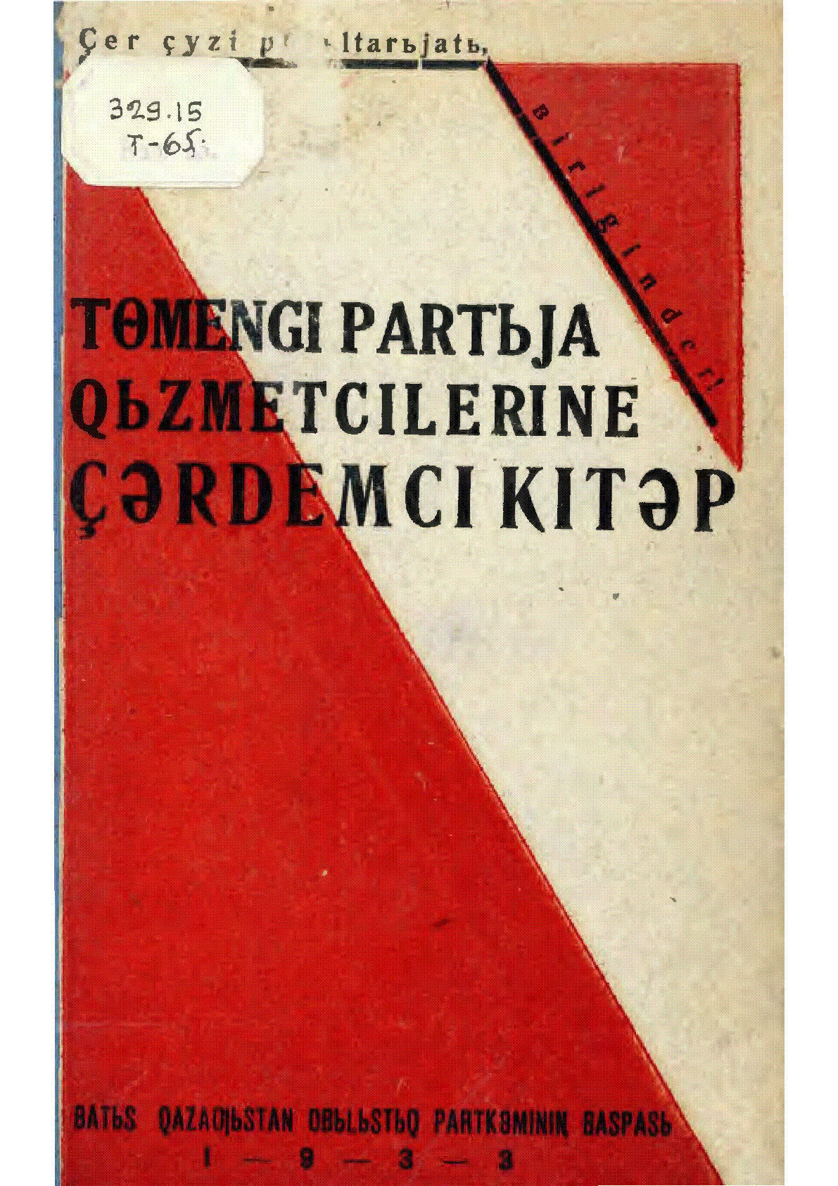 Төменгі партия қызметшілеріне жәрдемші кітап [Text] : Егін, мал шаруашылығы мәселелері жөніндегі партияның маңызды қаулыларының жинағы / ... – Орал : Батыс Қазақстан облыстық парткомның баспасы, 1933. - 80 б. - Латын графикасы. . . – 5000 дана