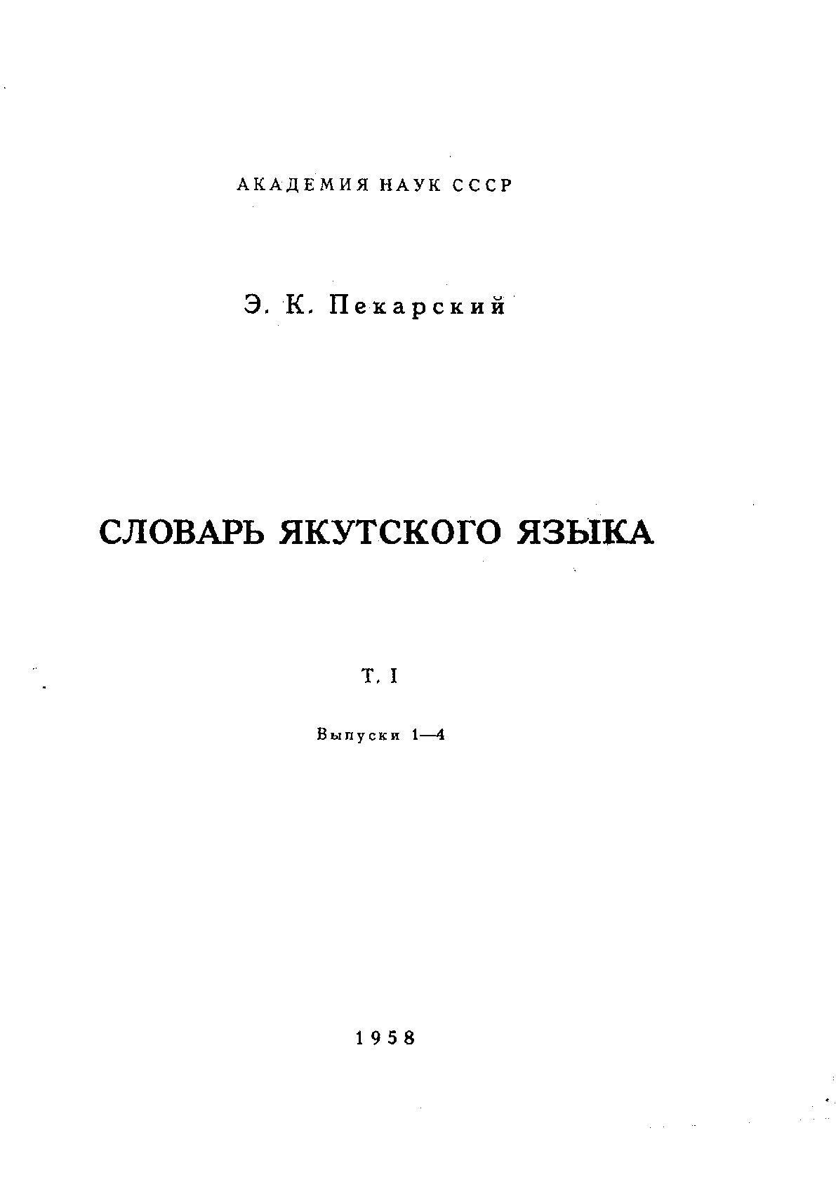 Словарь якутского языка [Текст] / Э. К. Пекарский ; Акад. наук СССР . – [2-е изд.] ,- [Москва] : [б. и.] , 1958.– [б. т.] . (в пер.) - Отпечат. фотомехан. способом с 1-го изд. (1907-1930 гг.). - Шора Сарыбаев қоры . Библиогр.: с. I-XVIII Т. 1, вып. 1-4 .– c. I-XX, c. 1-1279 (в пер.) : 0 тг.