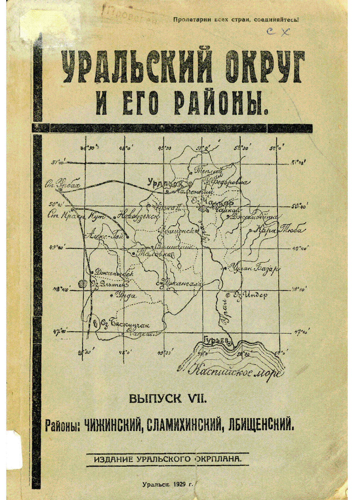 Уральский округ и его районы [Текст] : [в 9 вып.] ; КазССР, Уральская окружная плановая комиссия .- Уральск : Издание Уральского ОКРПЛАНА , 1929.– 1000 экз. . (в пер.) Вып. 7 . Районы: Чижинский, Сламихинский, Лбищенский– 187, [II] с. (в пер.) : 50 тг.