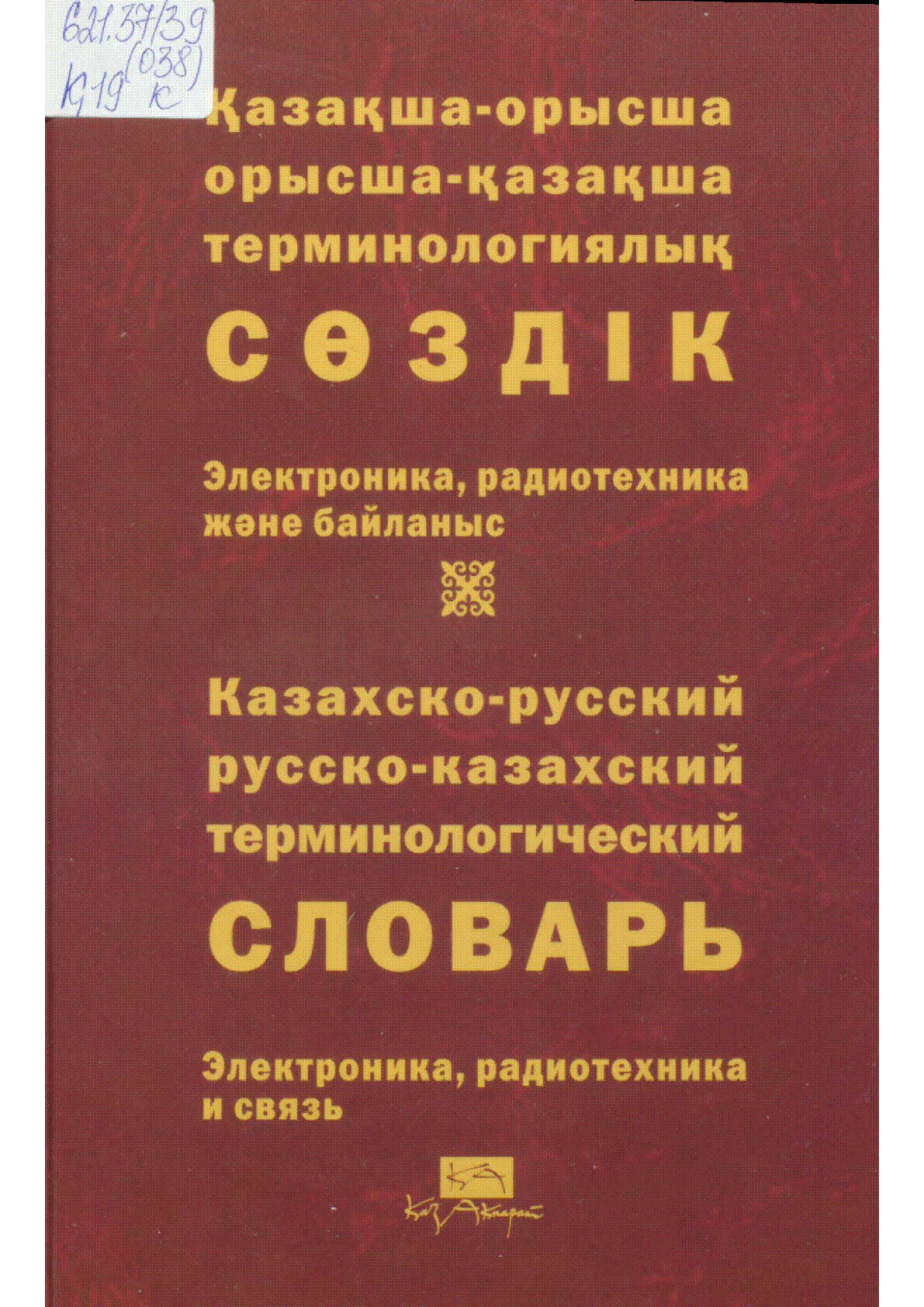Қазақша-орысша, орысша-қазақша терминологиялық сөздік [Мәтін] - Астана : ҚАЗақпарат , 2014.– 4000 дана . – 978-601-03-0301-0 - Қаз., орыс тіл. . 6-том . Электроника, радиотехника және байланыс : 9 000-ға жуық термин– 428 бет : 715,68 теңге