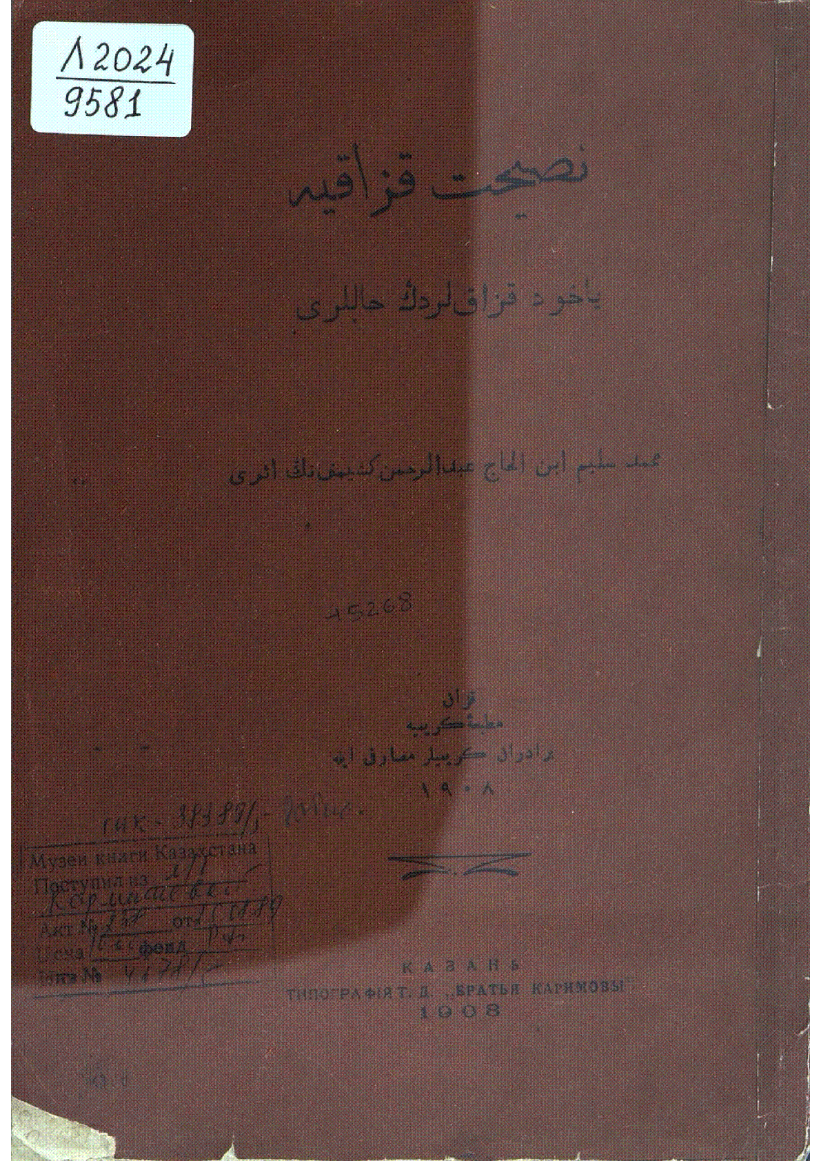 Қазақша насихат немесе қазақтардың халдері = نصيحت قزاقيه ياخود قزاق لردڭ حاللرى [Text] / Ғ. Қашимов ... – Қазан : Ағайынды Каримовтар баспаханасы, [1908]. - [20] б. - Мәтін араб қарпімен . . – [т. ж.] : 0 тг.